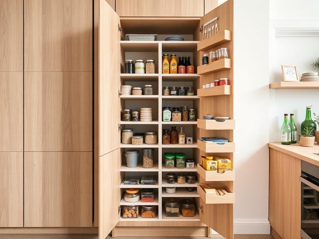 Utdragbara lådor i skafferiet ger dig full överblick över innehållet. Med mjukstängande beslag och full utdragning når du enkelt allt – från tyngre konserver till lättare förpackningar.