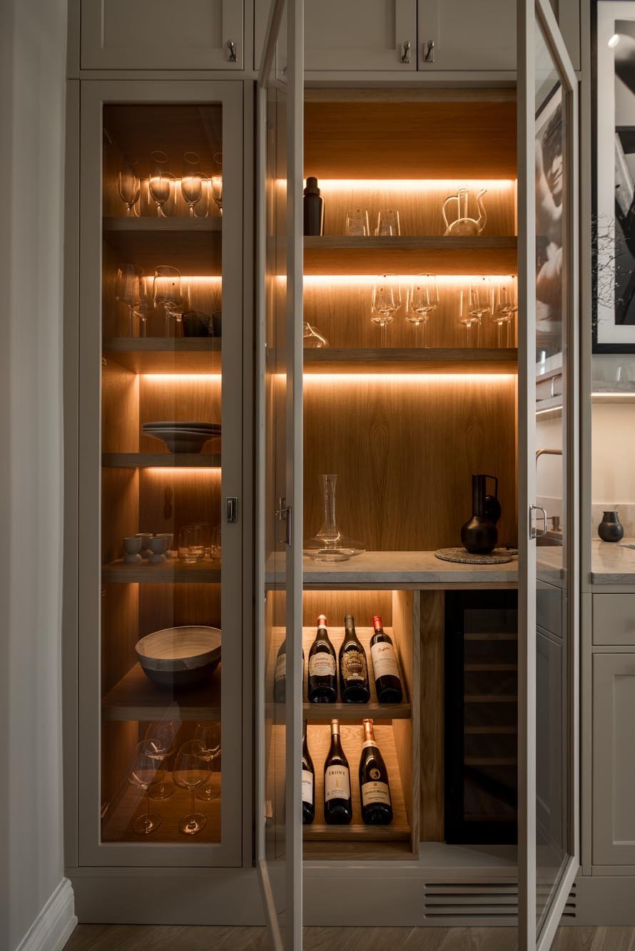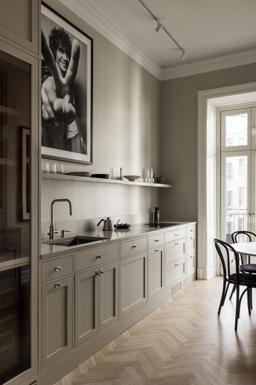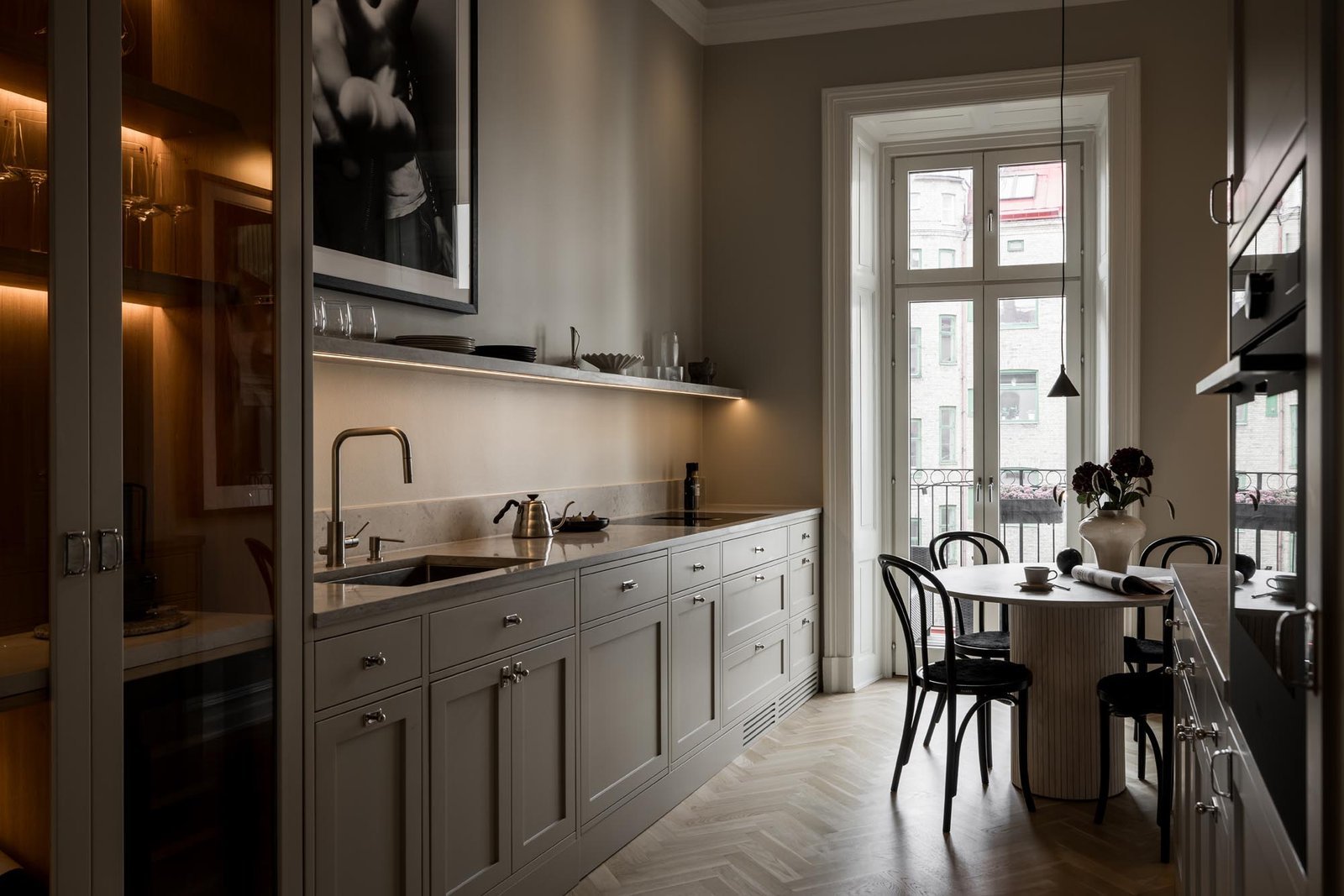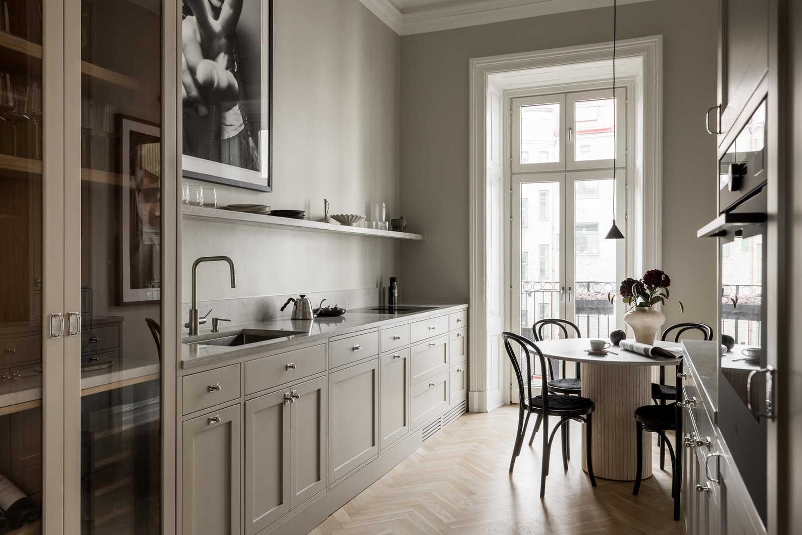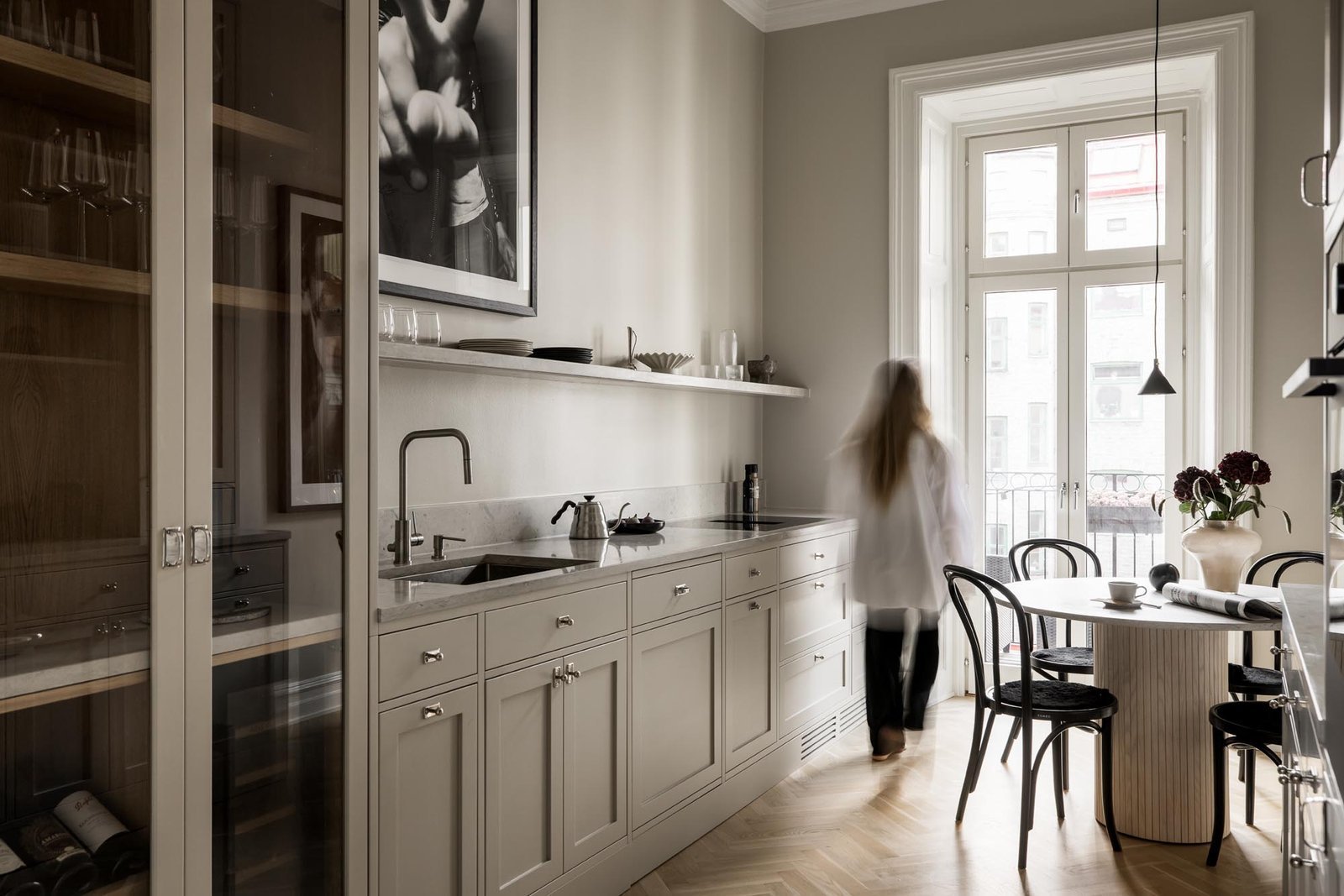 Ett harmoniskt kök där marmordetaljer, vitrinskåp och smarta förvaringslösningar möter en tidlös design som både inspirerar och fungerar i vardagen.