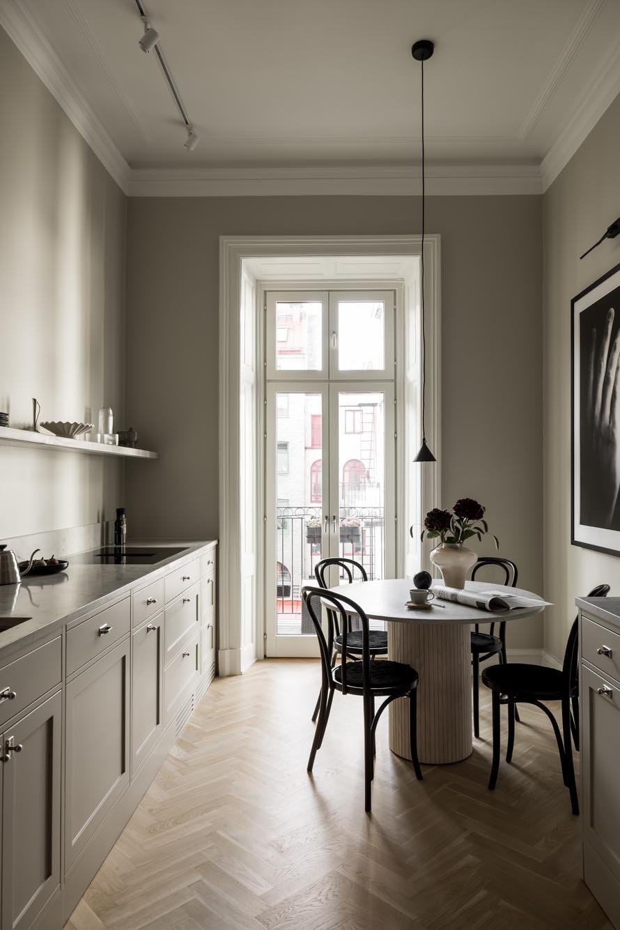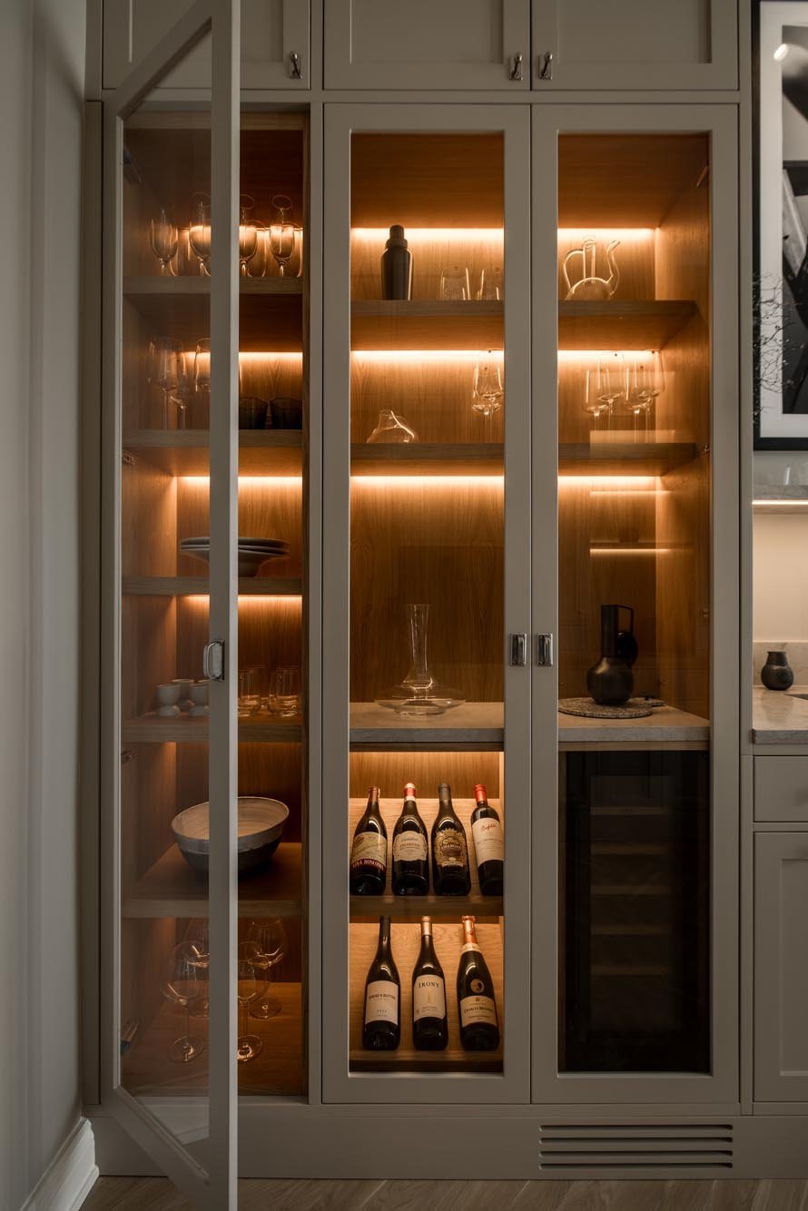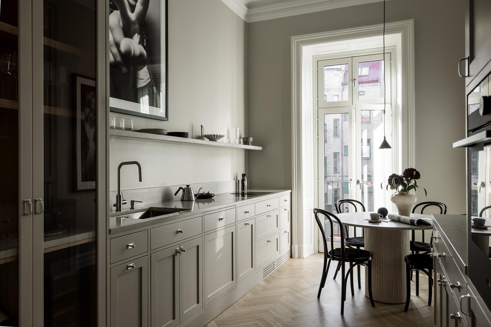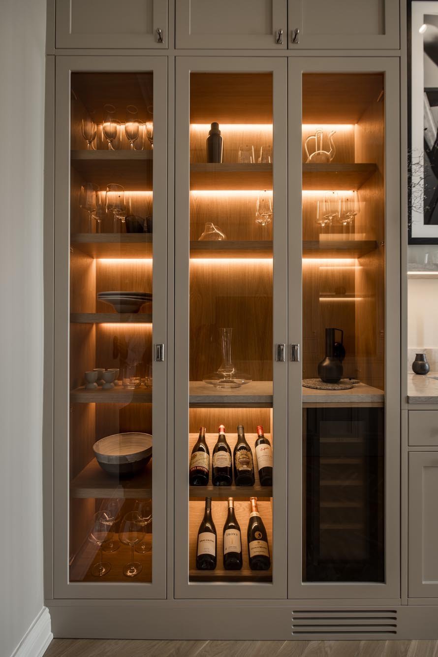 Ett harmoniskt kök där marmordetaljer, vitrinskåp och smarta förvaringslösningar möter en tidlös design som både inspirerar och fungerar i vardagen.