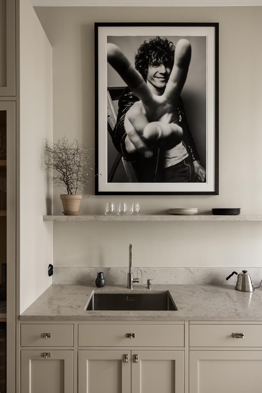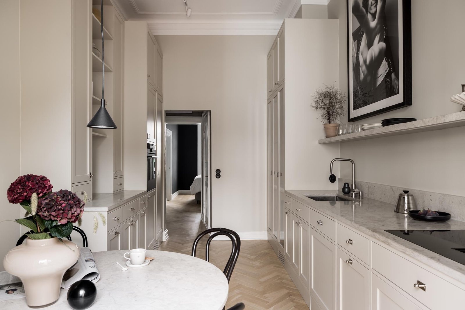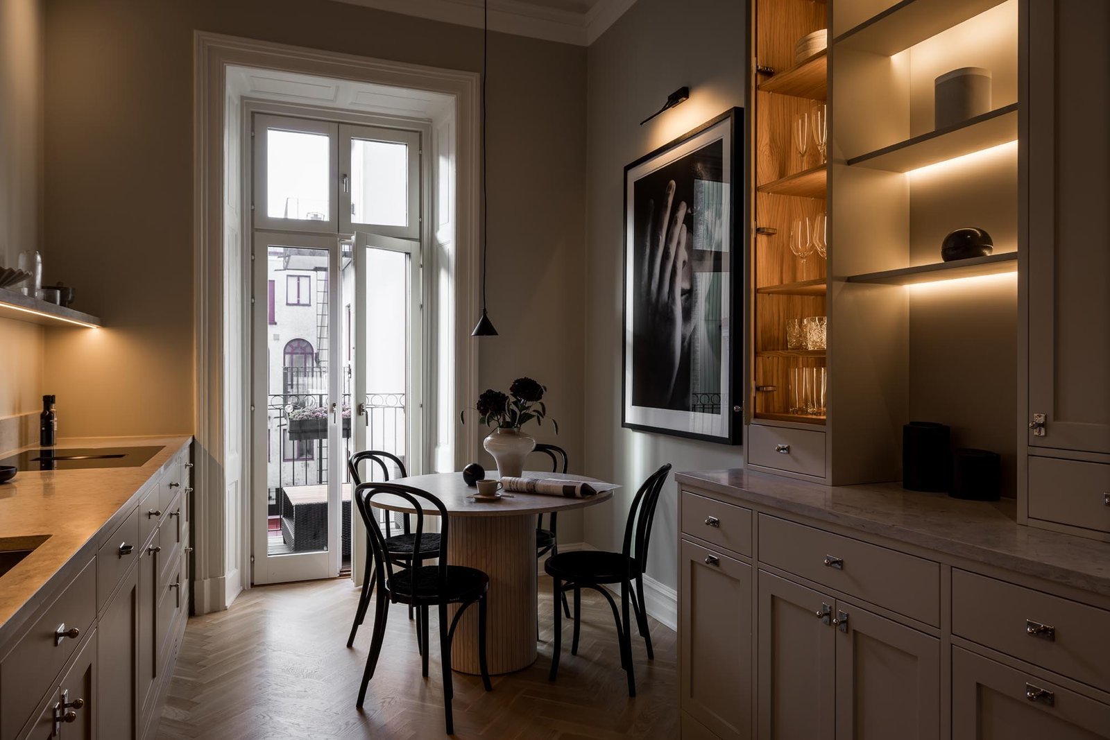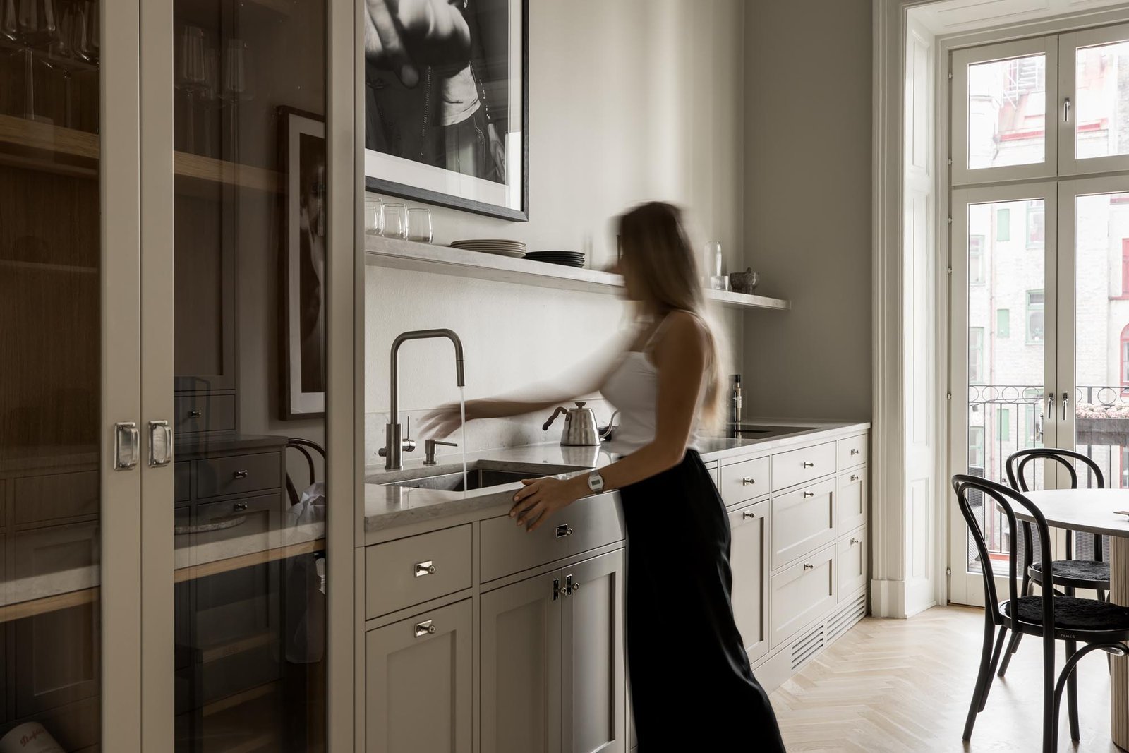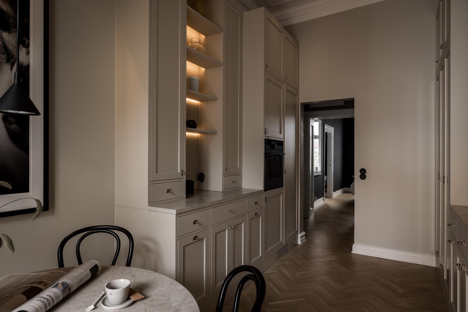 Ett harmoniskt kök där marmordetaljer, vitrinskåp och smarta förvaringslösningar möter en tidlös design som både inspirerar och fungerar i vardagen.