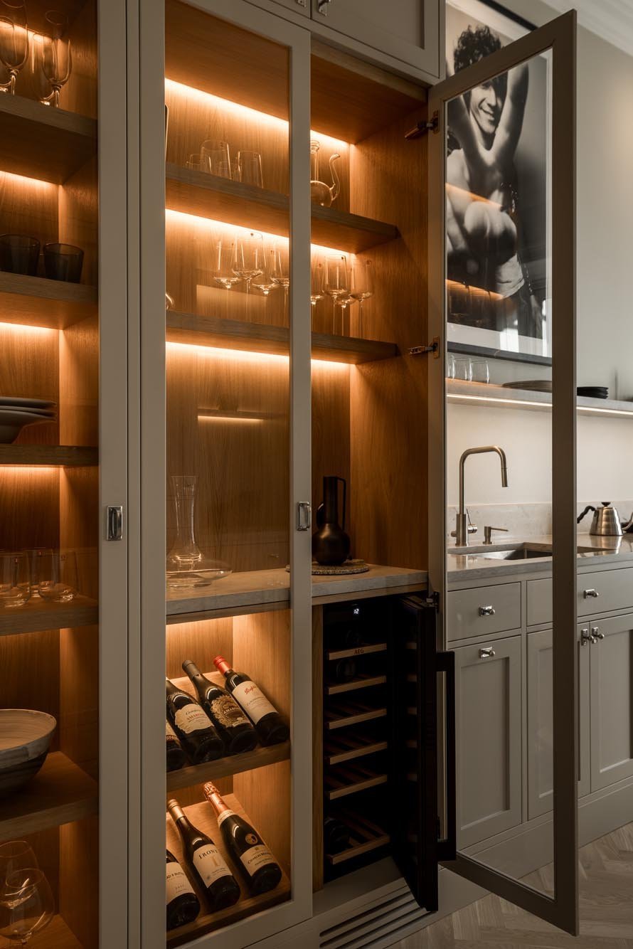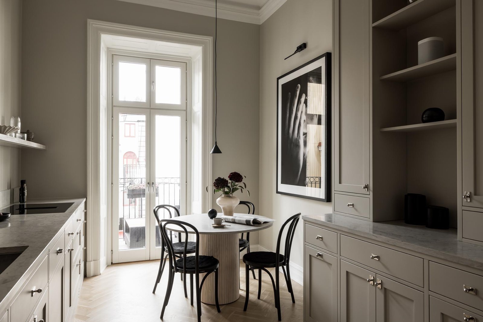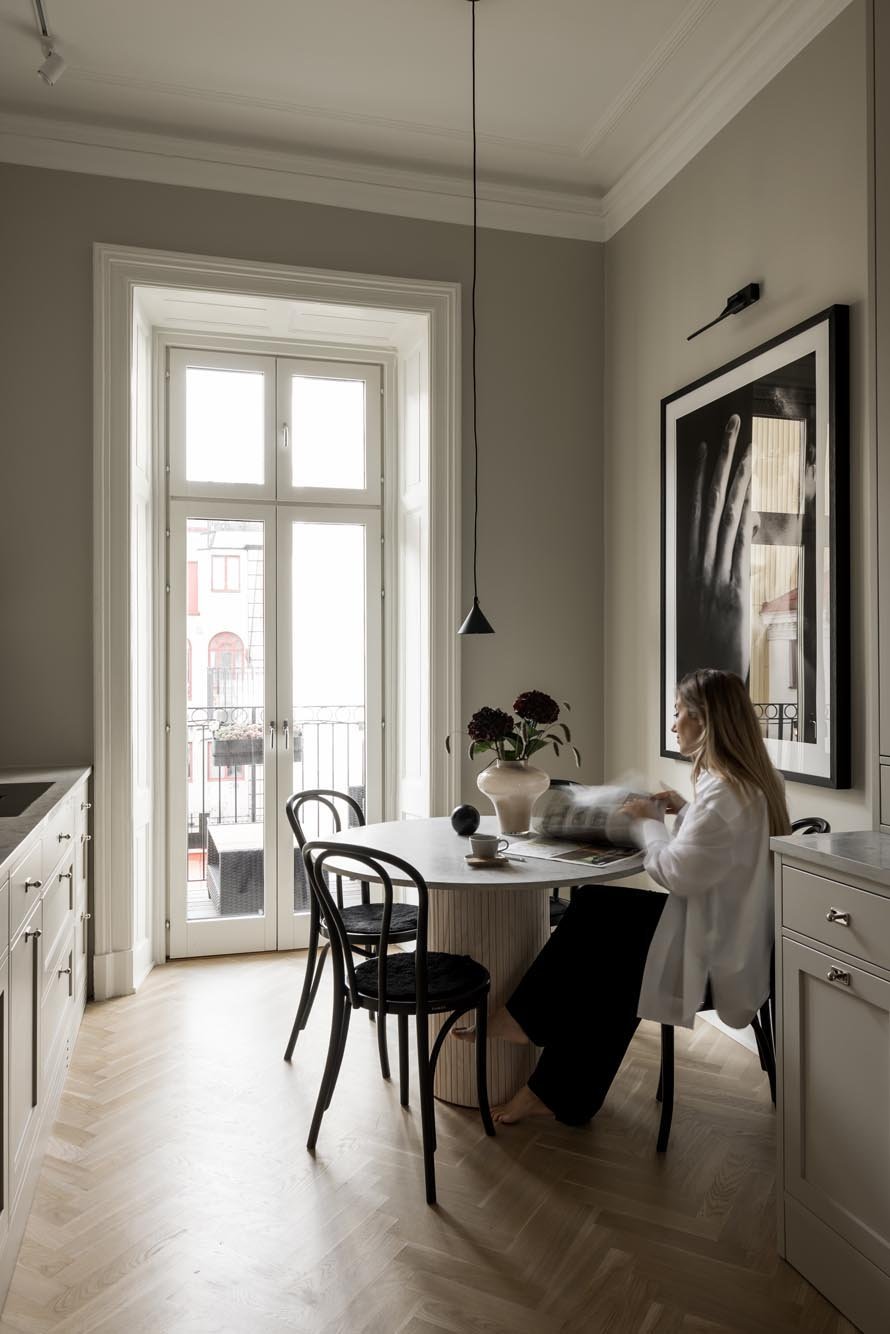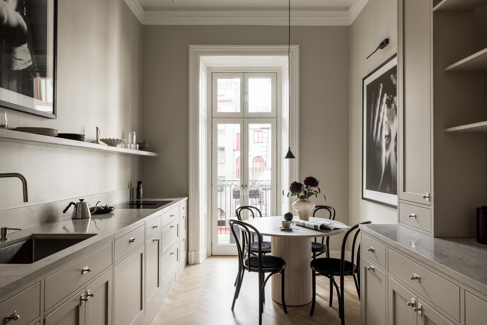 Ett harmoniskt kök där marmordetaljer, vitrinskåp och smarta förvaringslösningar möter en tidlös design som både inspirerar och fungerar i vardagen.