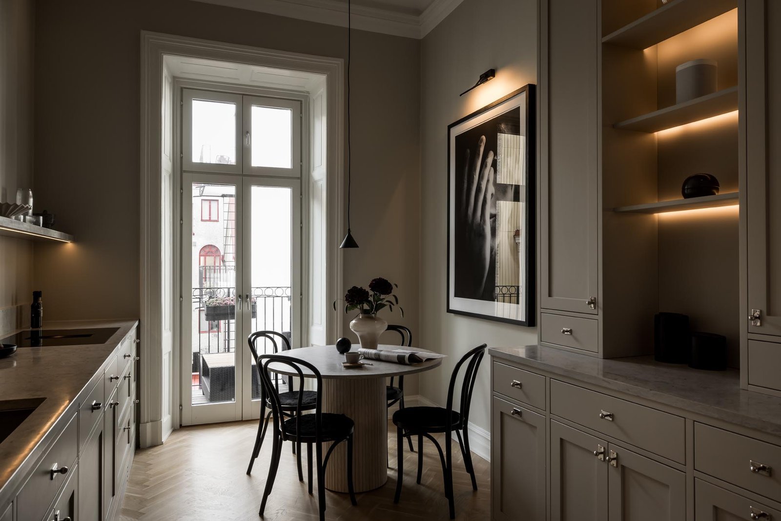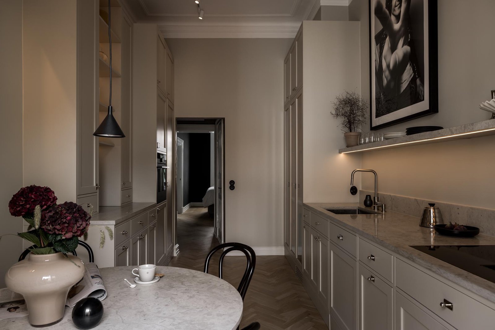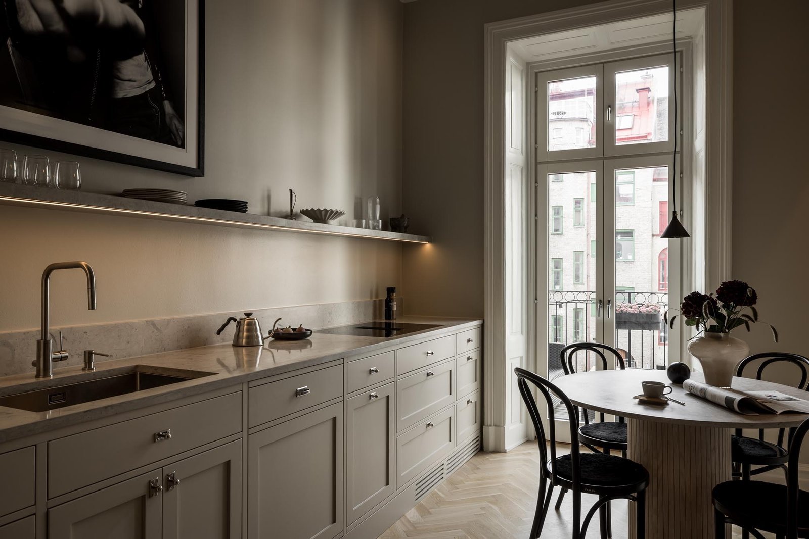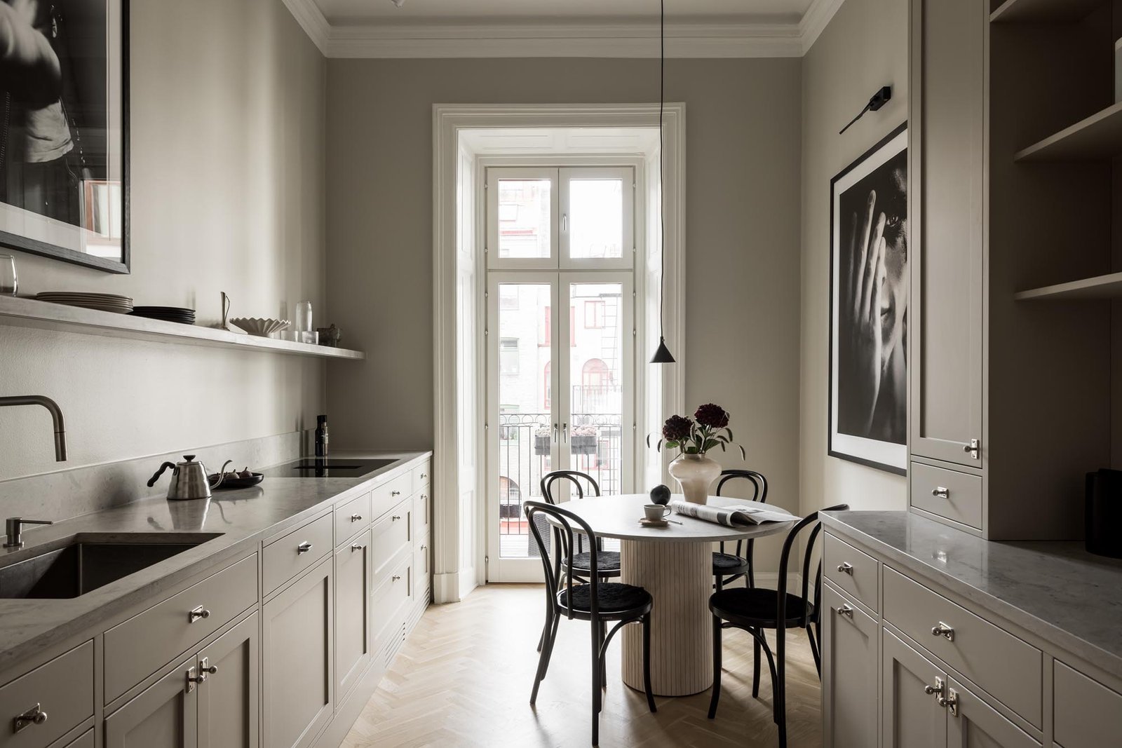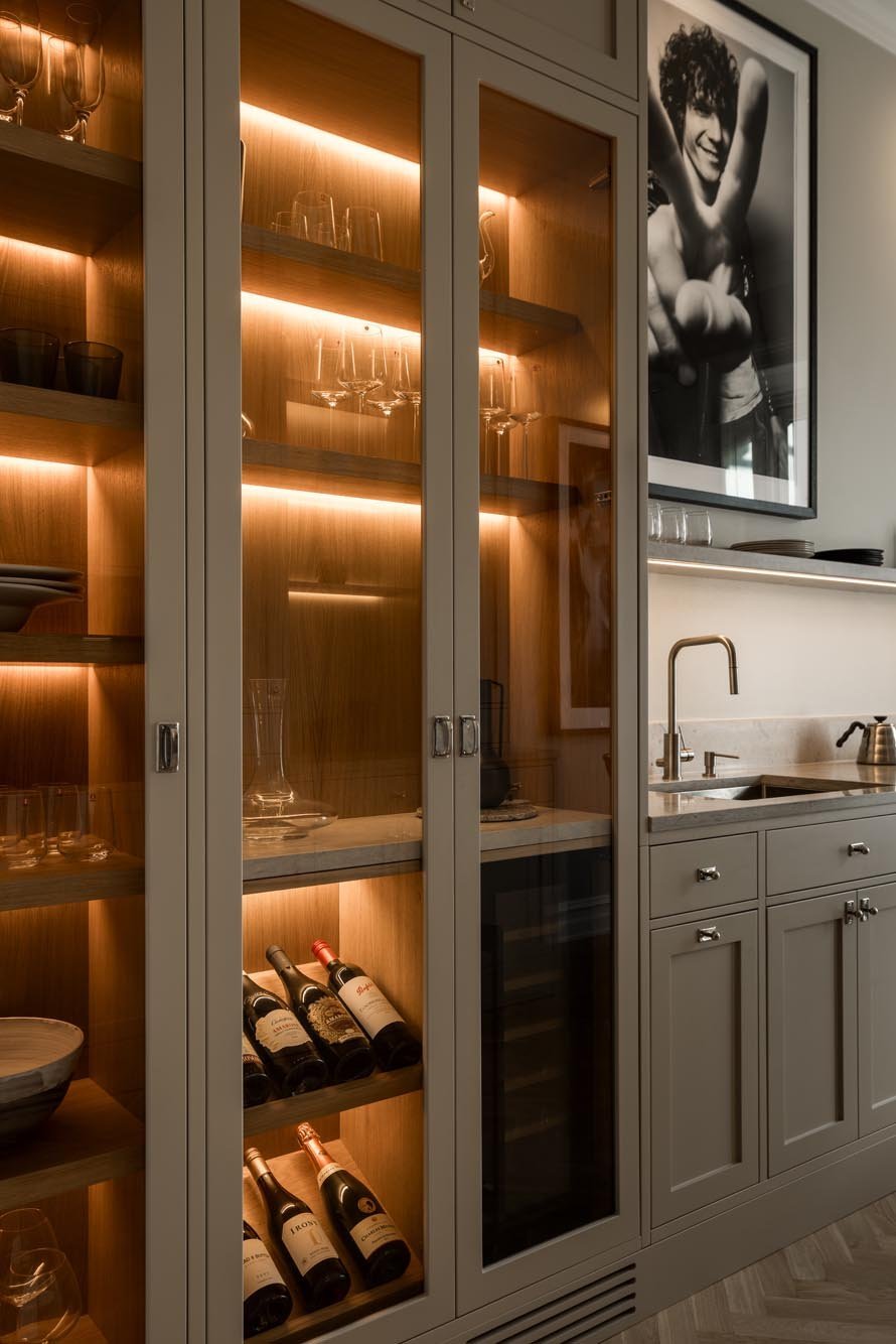 Ett harmoniskt kök där marmordetaljer, vitrinskåp och smarta förvaringslösningar möter en tidlös design som både inspirerar och fungerar i vardagen.