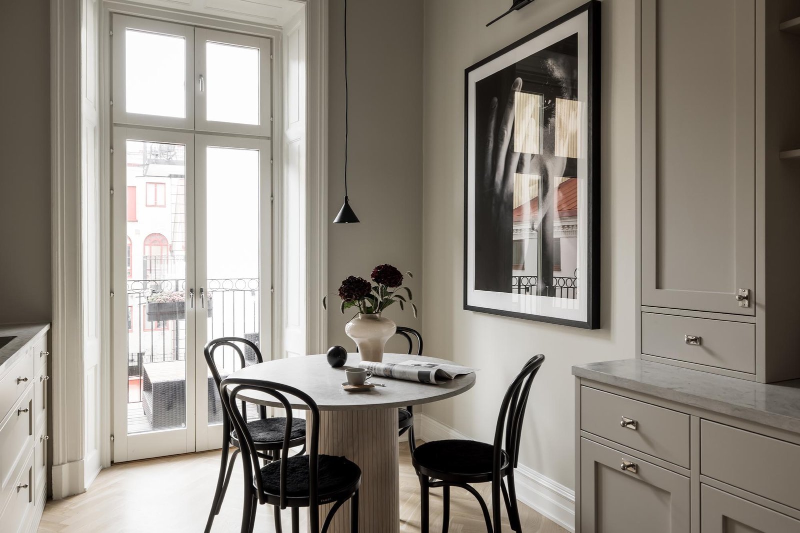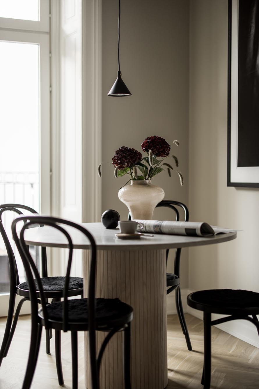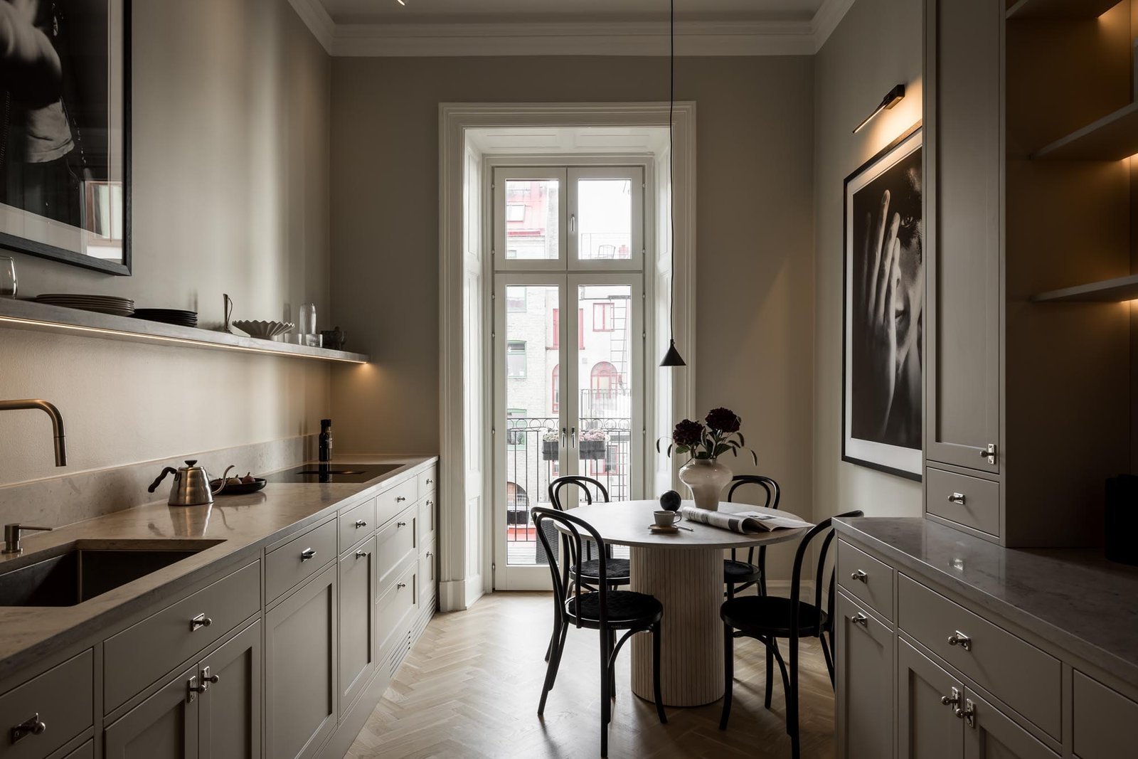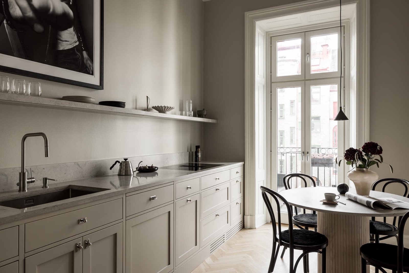 Ett harmoniskt kök där marmordetaljer, vitrinskåp och smarta förvaringslösningar möter en tidlös design som både inspirerar och fungerar i vardagen.