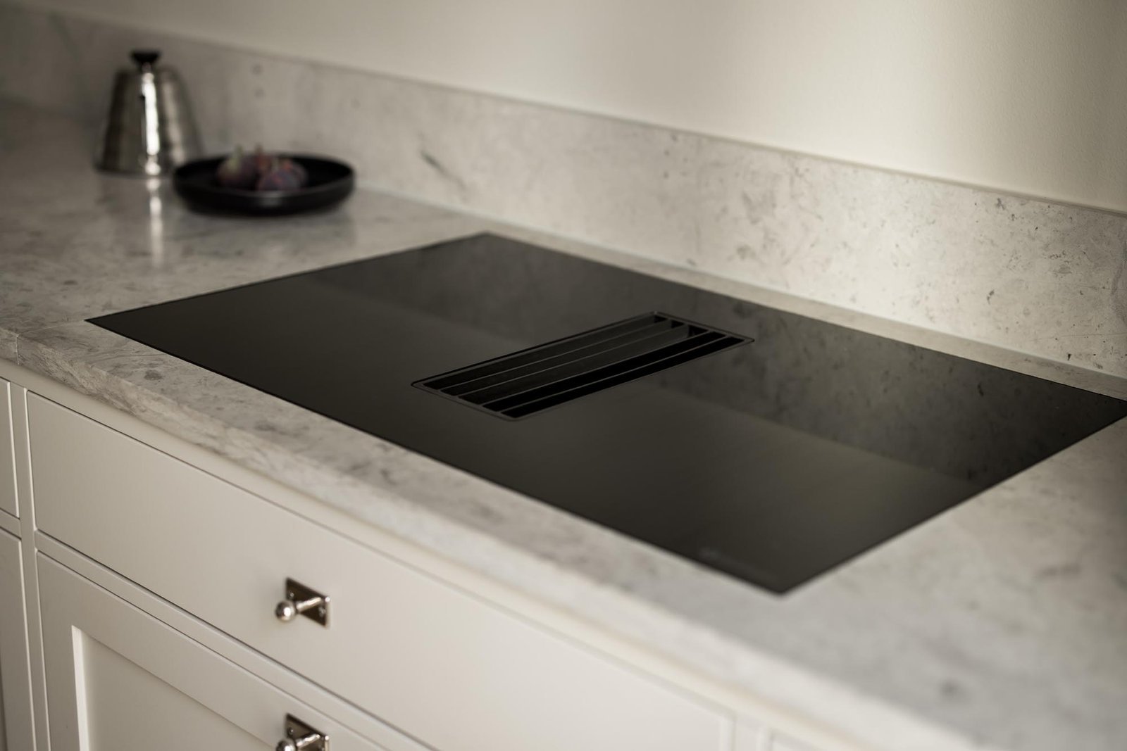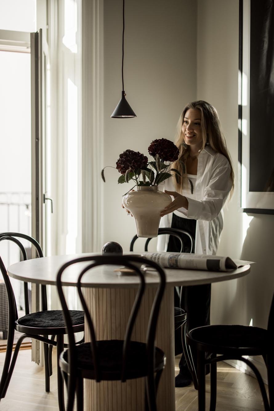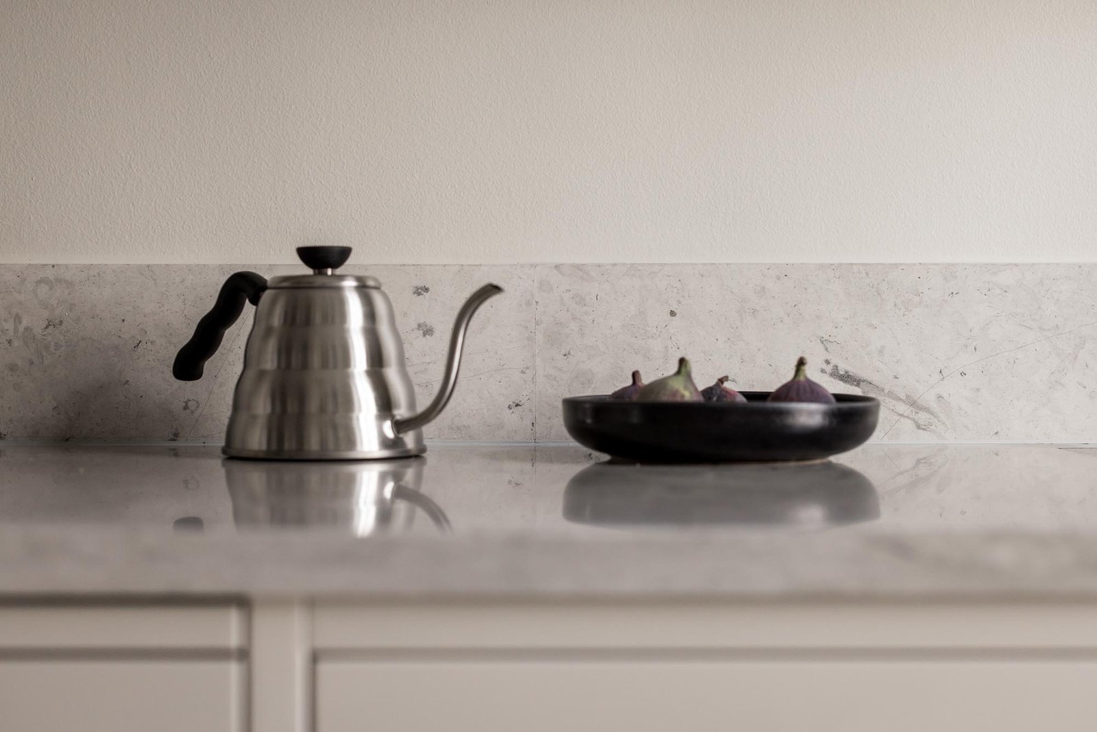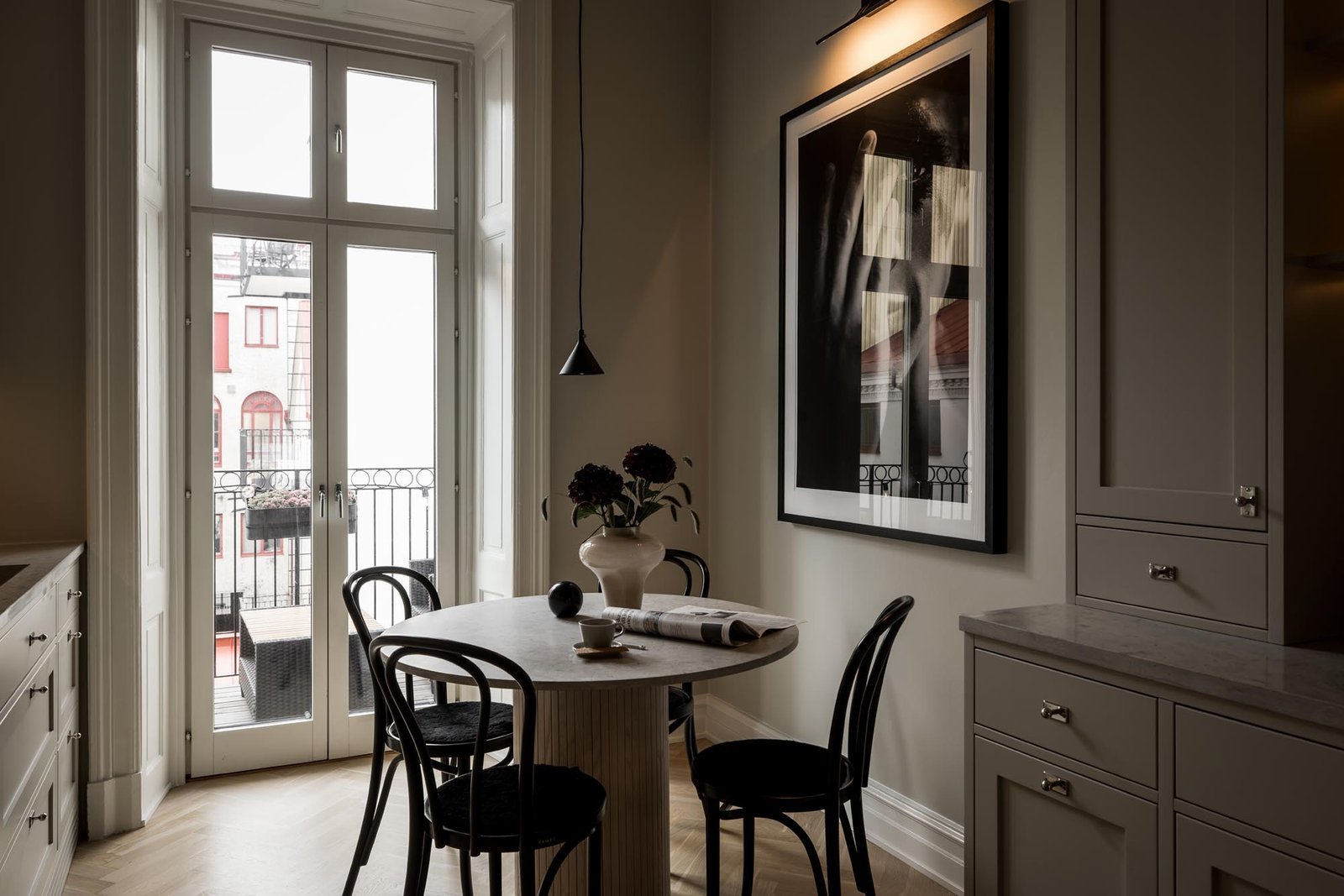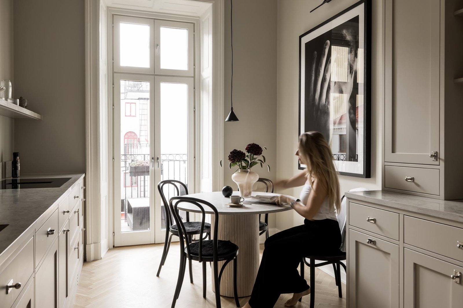 Ett harmoniskt kök där marmordetaljer, vitrinskåp och smarta förvaringslösningar möter en tidlös design som både inspirerar och fungerar i vardagen.