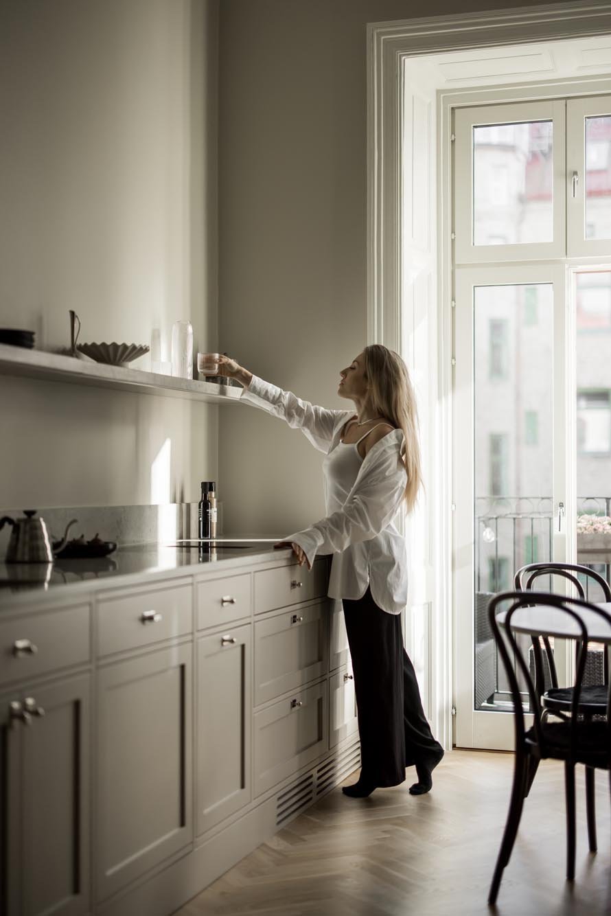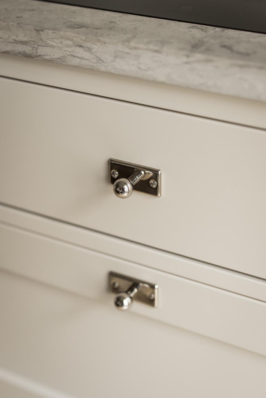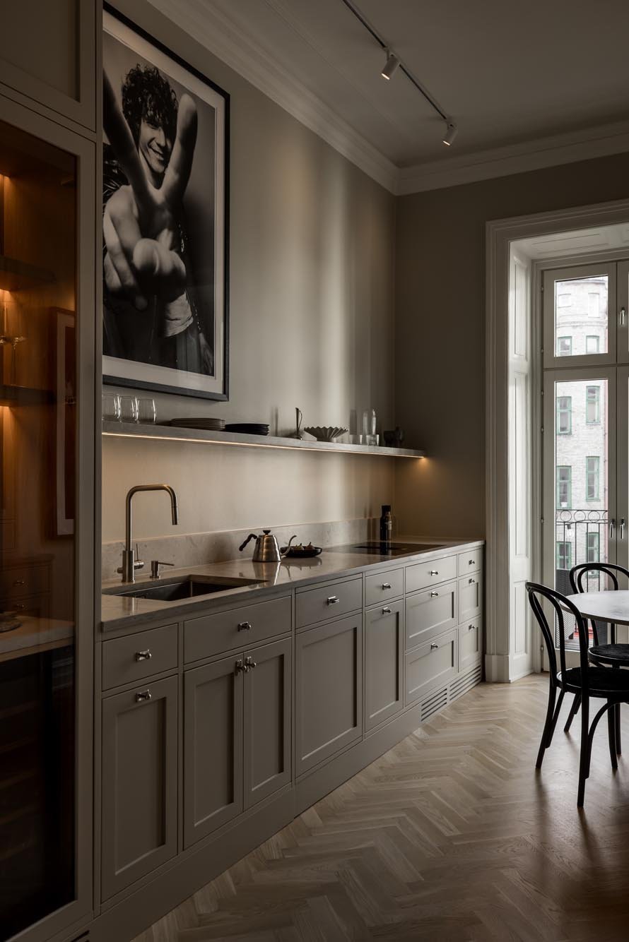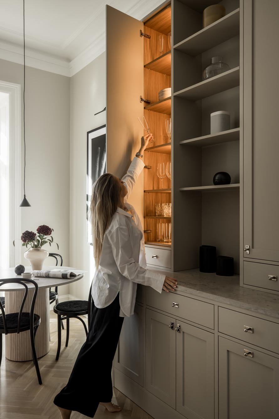 Vi valde en ljus, varm grå ton för luckor och ramar som ger köket en modern fräschör. Marmorbänkskivan tillför elegans utan att ta över, medan vitrinskåp med spröjsade glasdörrar bryter av mot de släta ytorna och skapar ett luftigare intryck. Förvaringslösningarna planerades noggrant med utdragbara kryddhyllor, specialfack för kastruller och en integrerad avfallssortering.