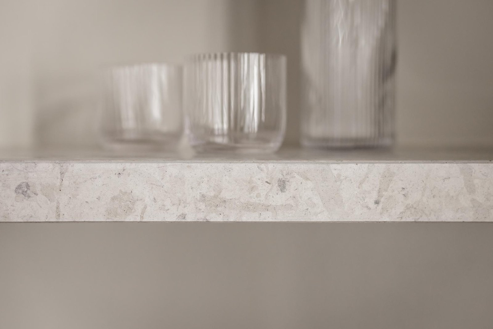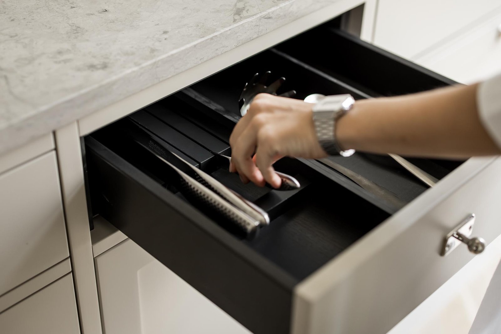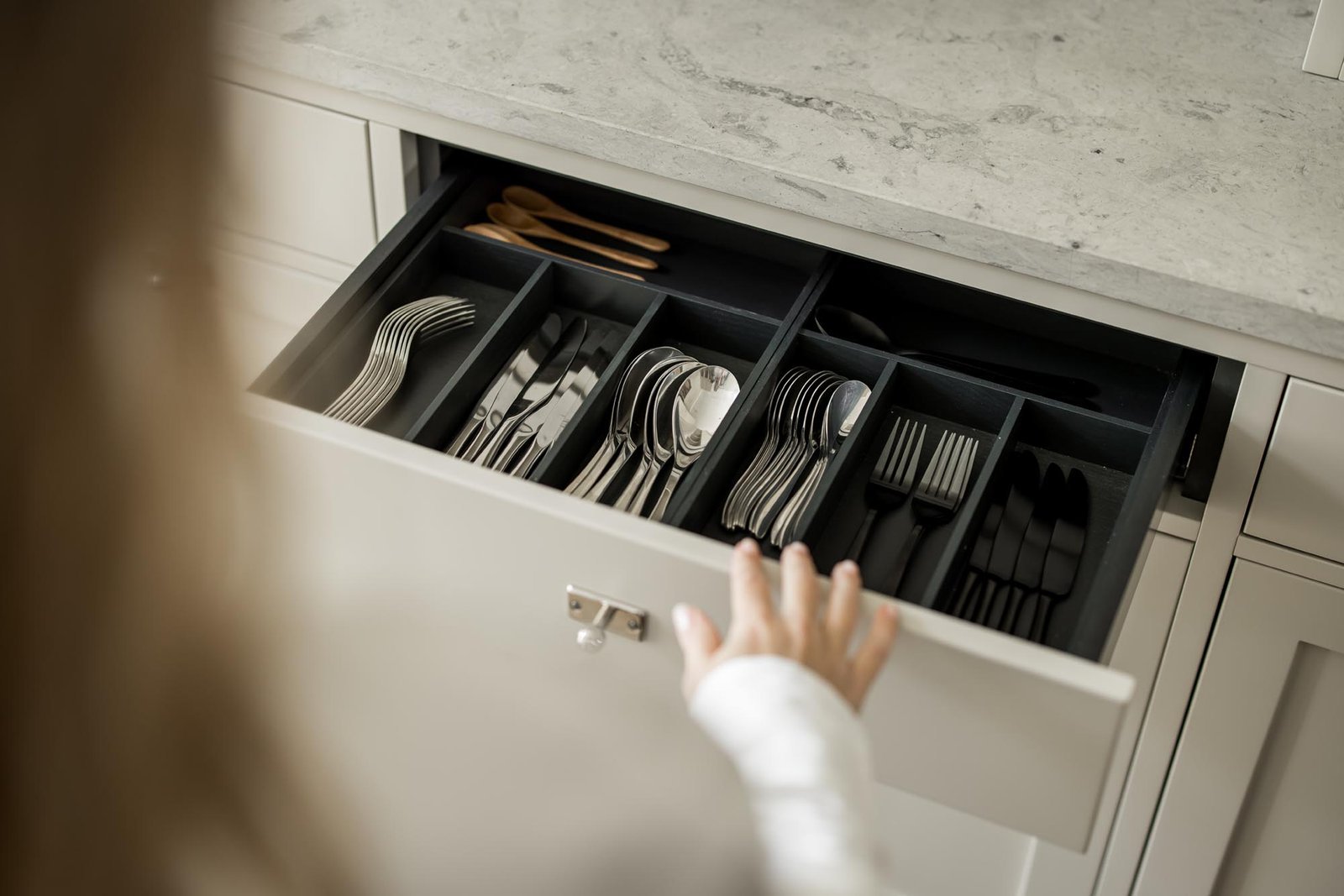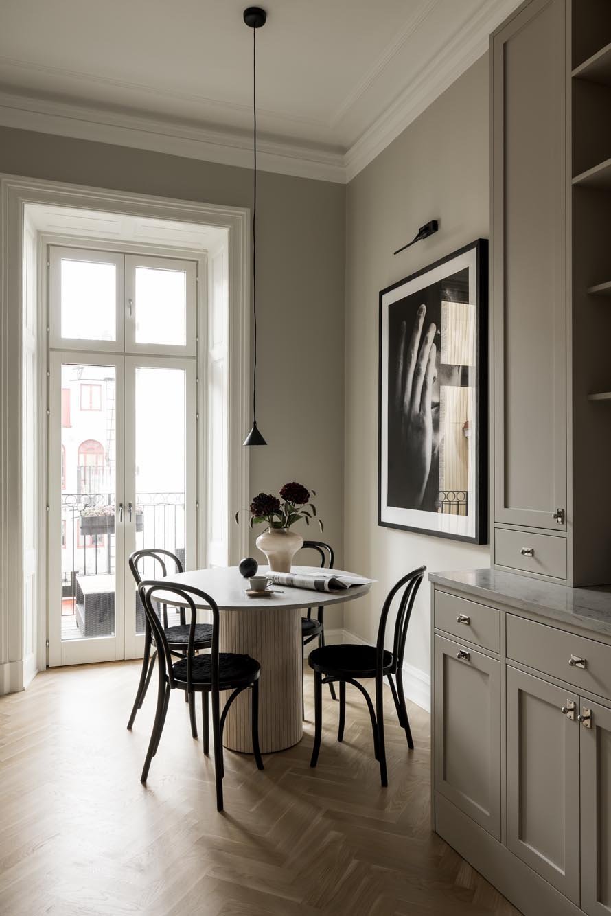 Vi valde en ljus, varm grå ton för luckor och ramar som ger köket en modern fräschör. Marmorbänkskivan tillför elegans utan att ta över, medan vitrinskåp med spröjsade glasdörrar bryter av mot de släta ytorna och skapar ett luftigare intryck. Förvaringslösningarna planerades noggrant med utdragbara kryddhyllor, specialfack för kastruller och en integrerad avfallssortering.