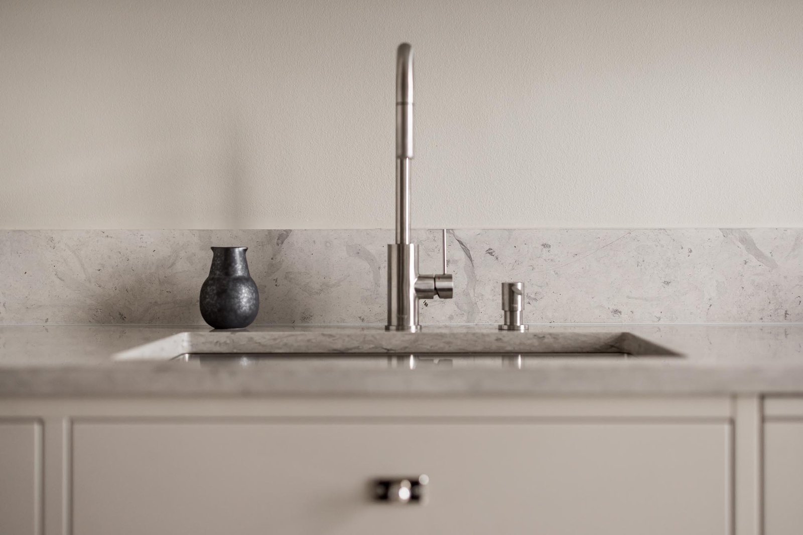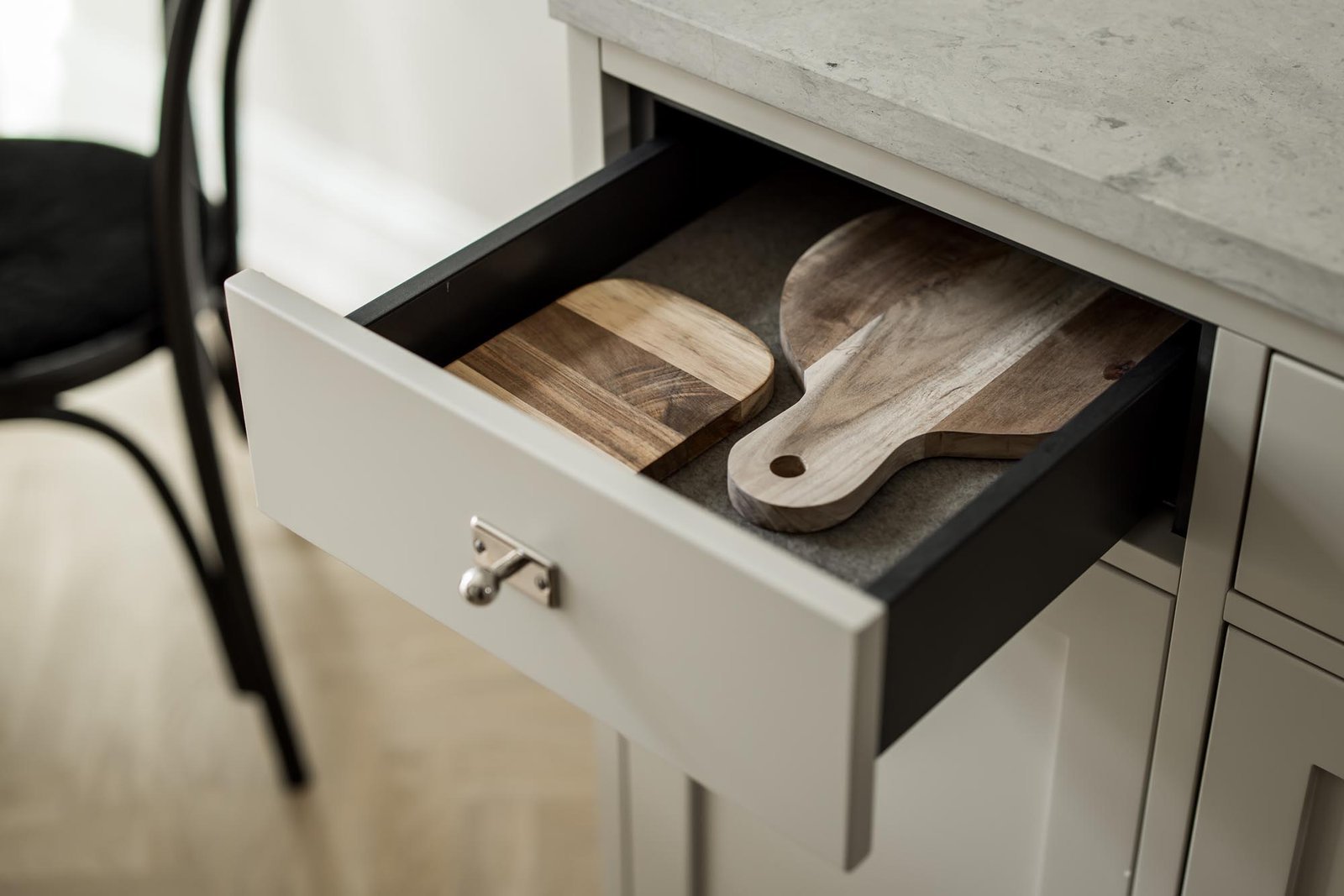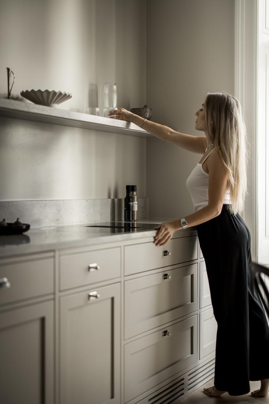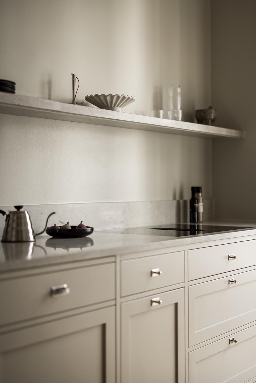 Kunden älskade den klassiska shakerstilen men ville undvika det alltför traditionella uttrycket som ibland kan kännas tungt och mörkt. Utmaningen var att skapa ett shakerkök som kändes fräscht och ljust, samtidigt som det behöll de klassiska proportionerna och detaljerna som gör stilen så tidlös.