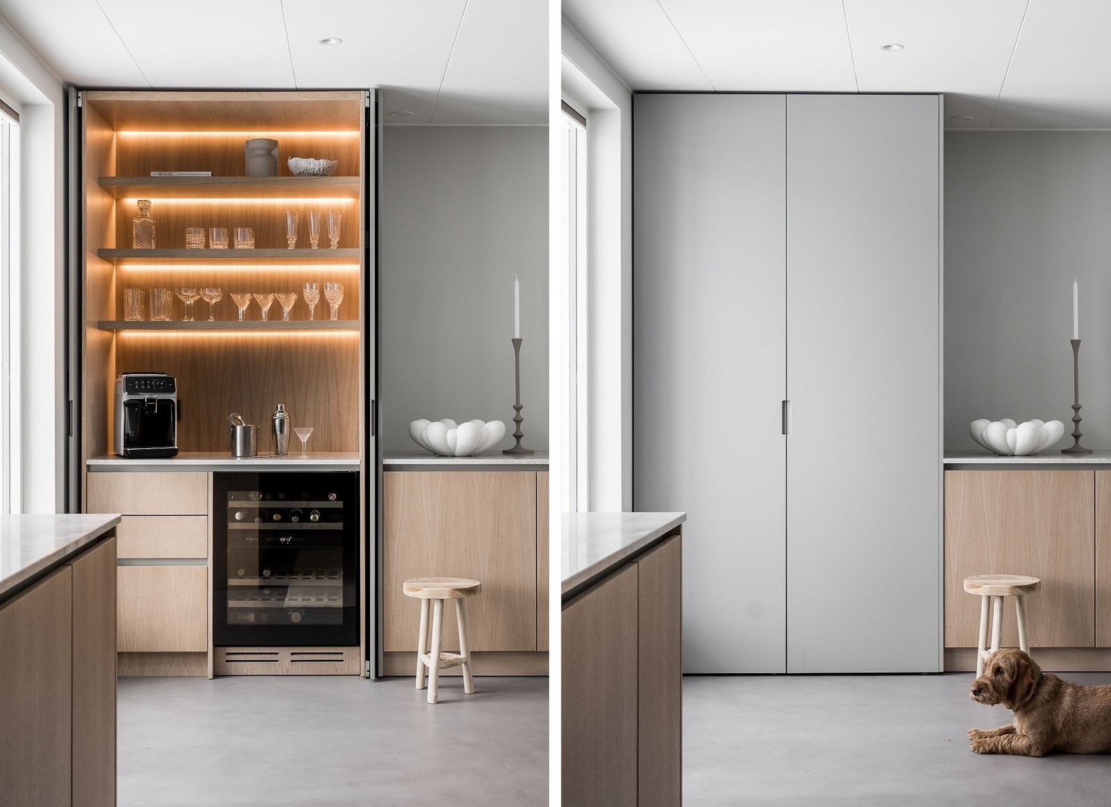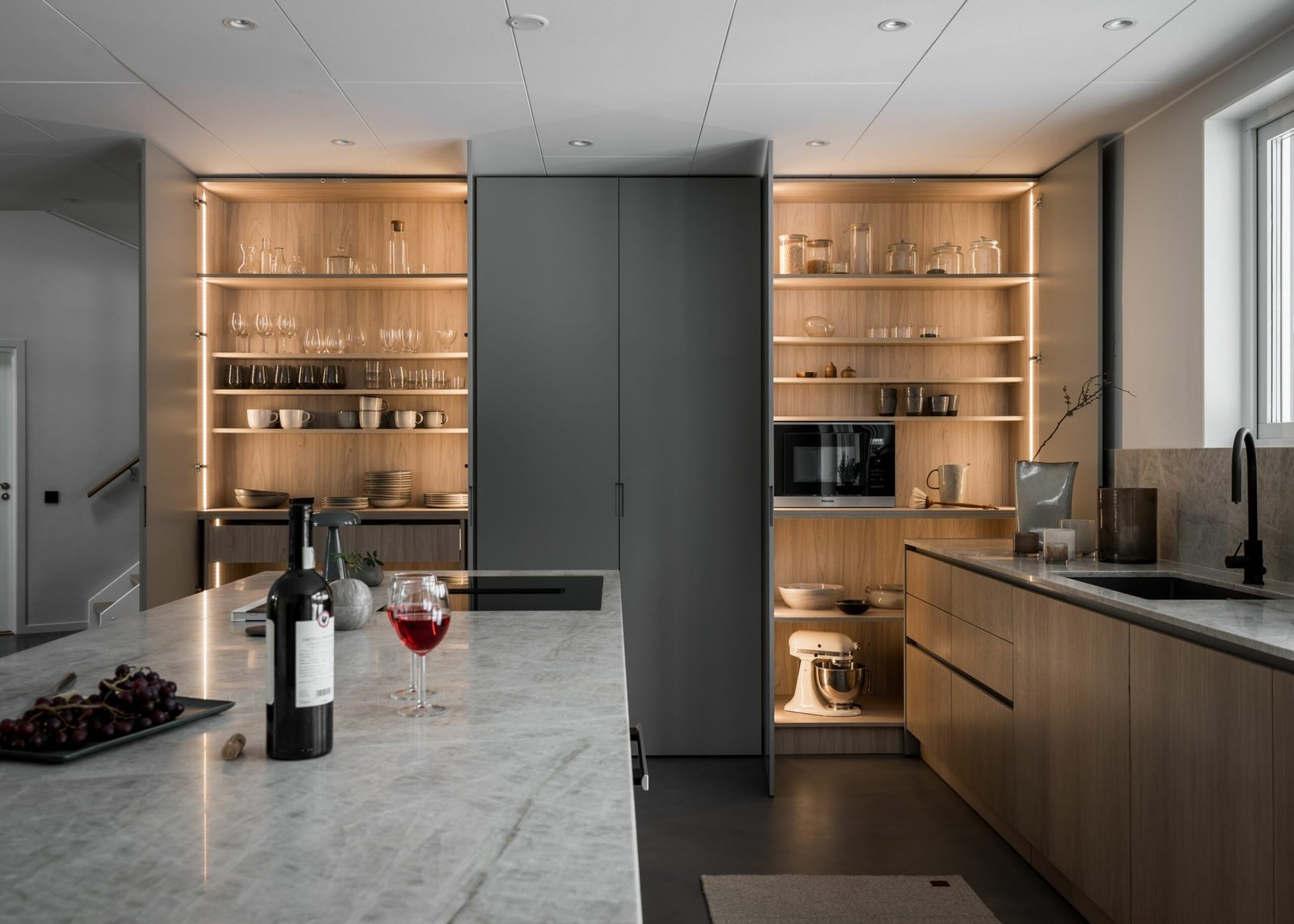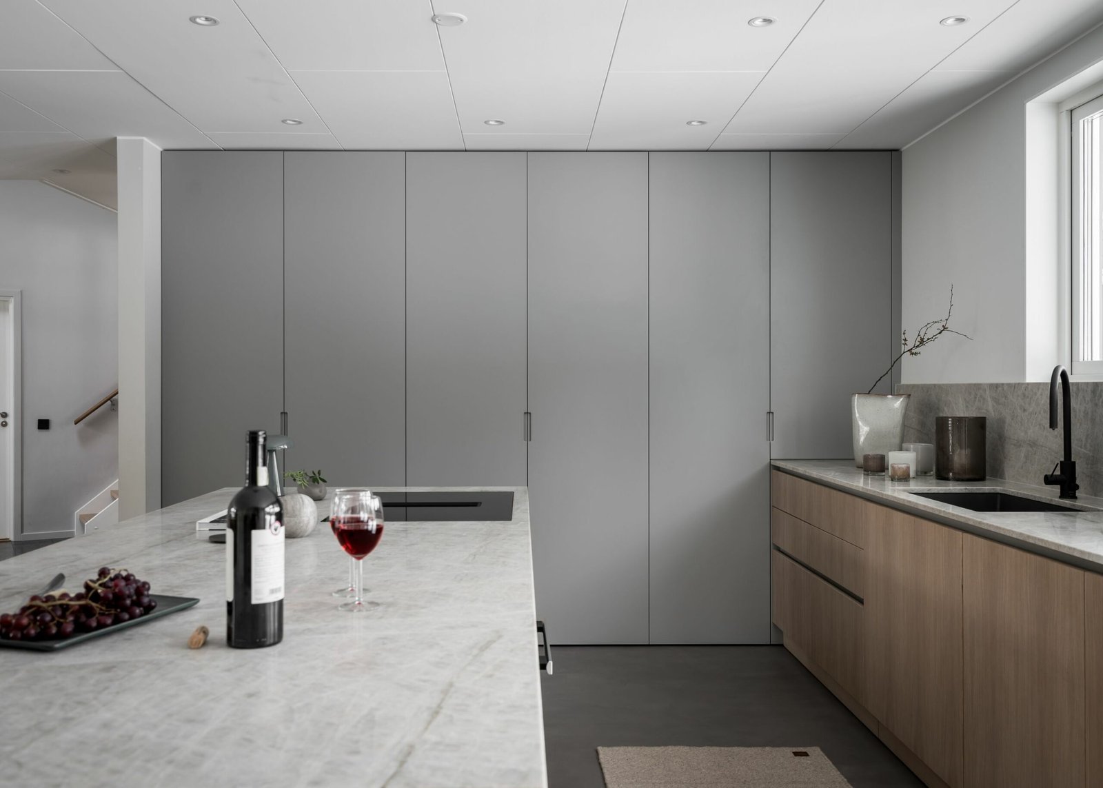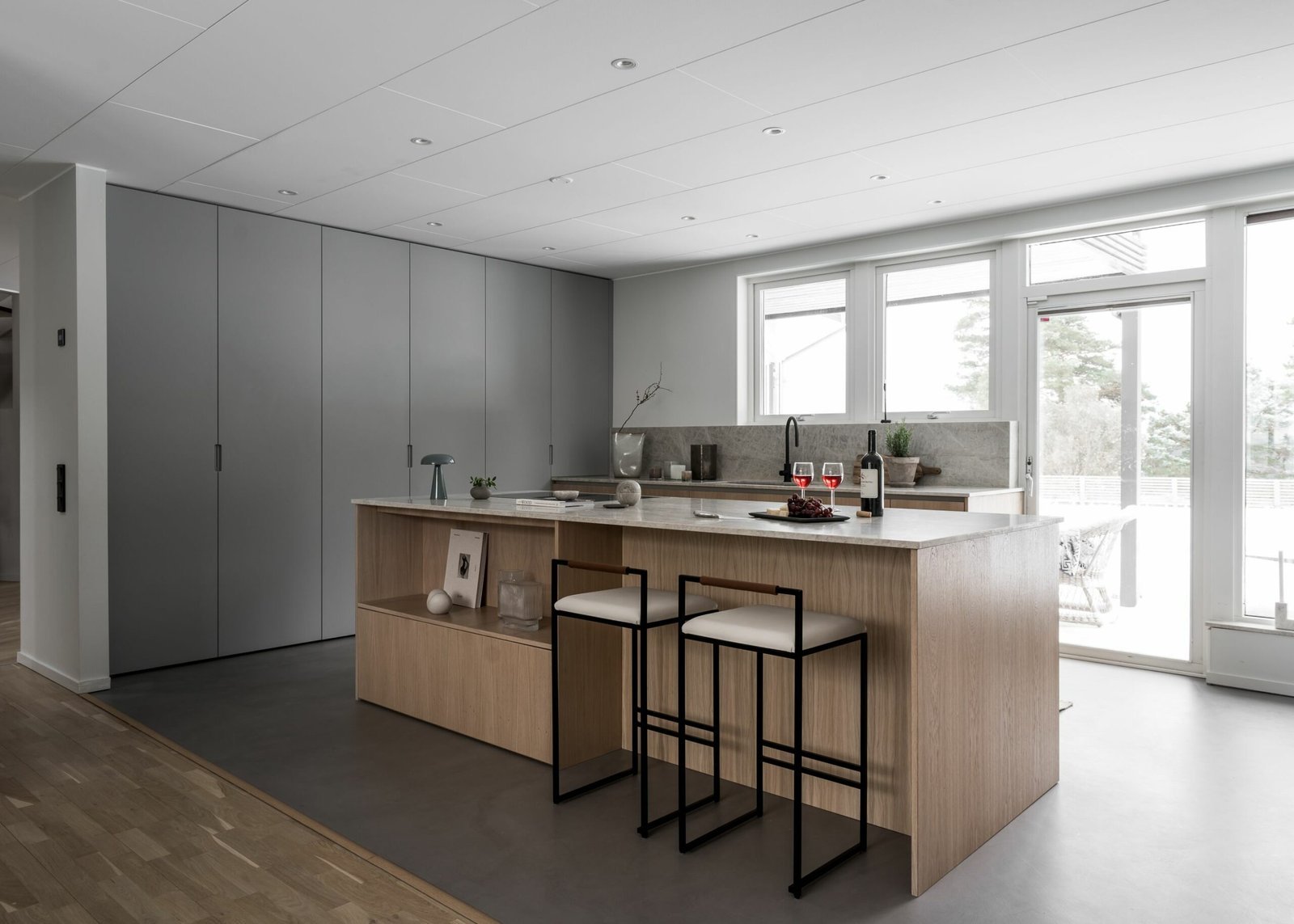 Köket andas skandinavisk enkelhet. Utan överskåp känns rummet dubbelt så stort, och de öppna hyllorna uppmuntrar till att hålla ordning och visa upp vackra föremål. Köksön har blivit familjens naturliga samlingsplats – tillräckligt stor för matlagning på ena sidan och läxläsning på den andra.