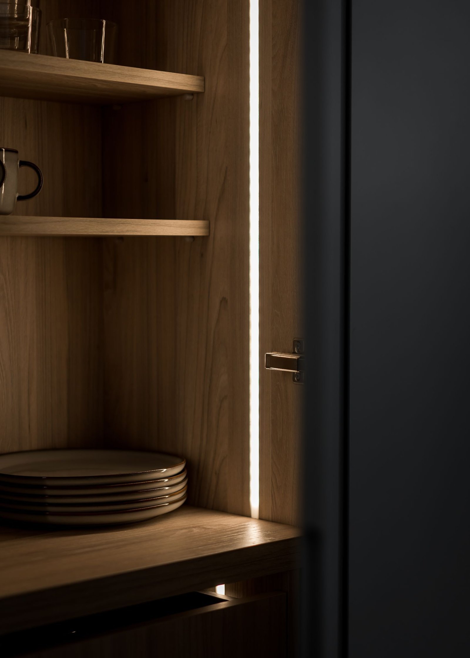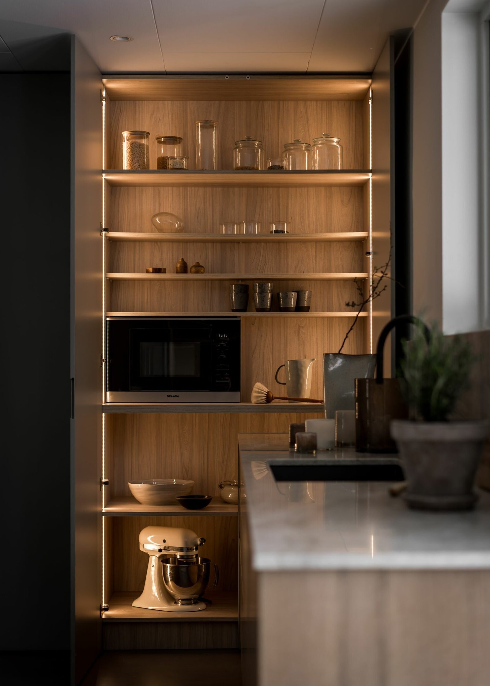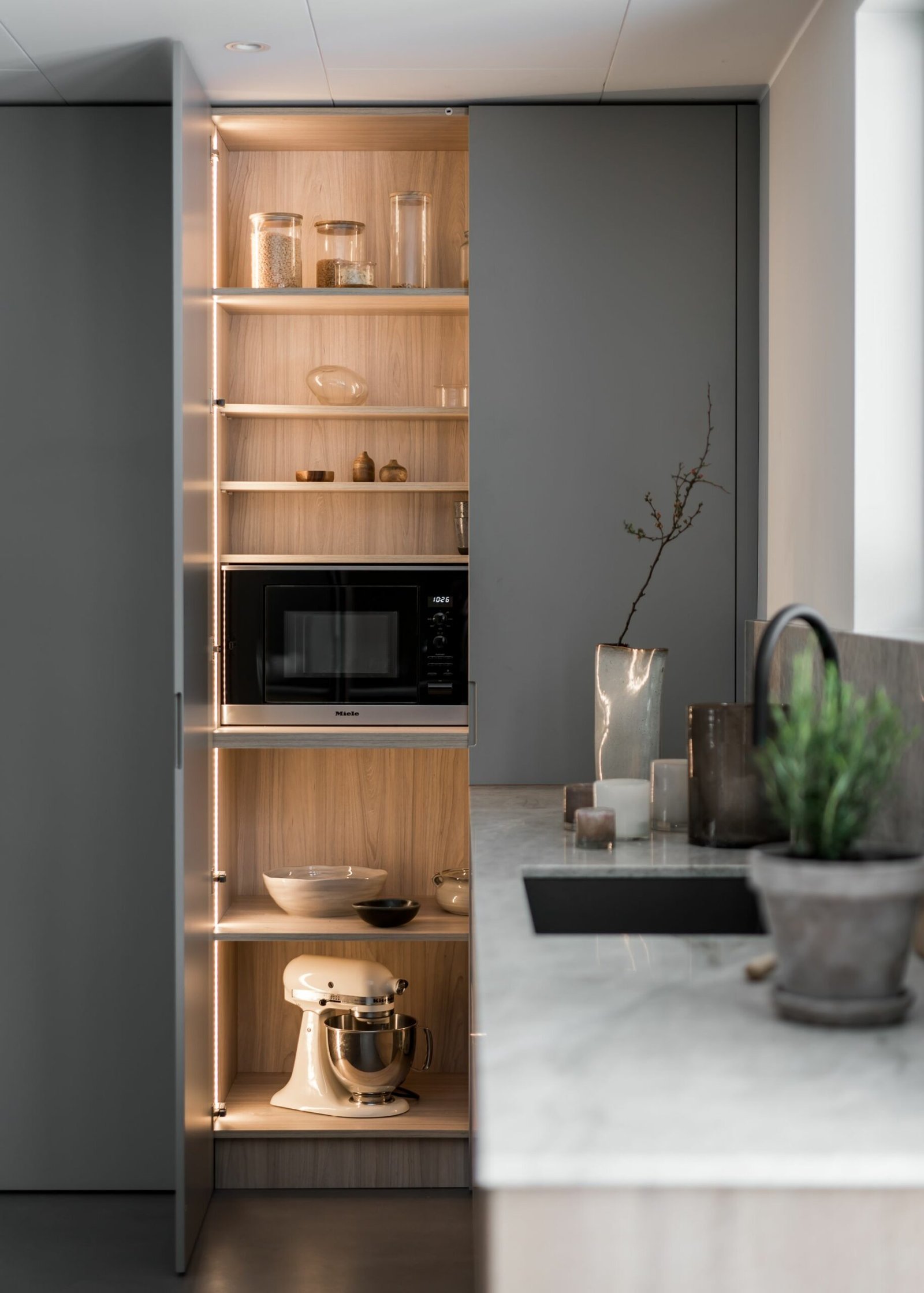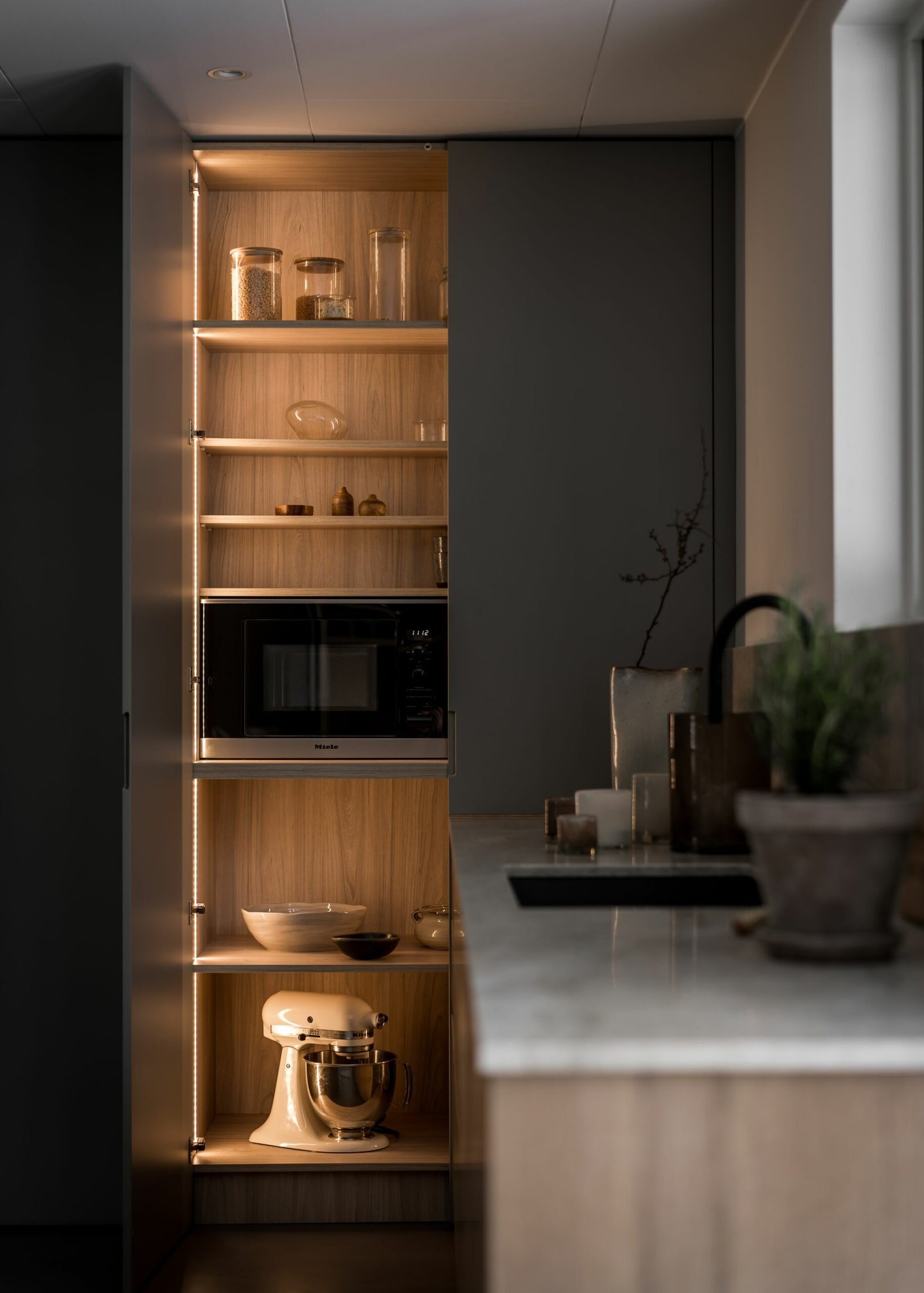 Köket andas skandinavisk enkelhet. Utan överskåp känns rummet dubbelt så stort, och de öppna hyllorna uppmuntrar till att hålla ordning och visa upp vackra föremål. Köksön har blivit familjens naturliga samlingsplats – tillräckligt stor för matlagning på ena sidan och läxläsning på den andra.