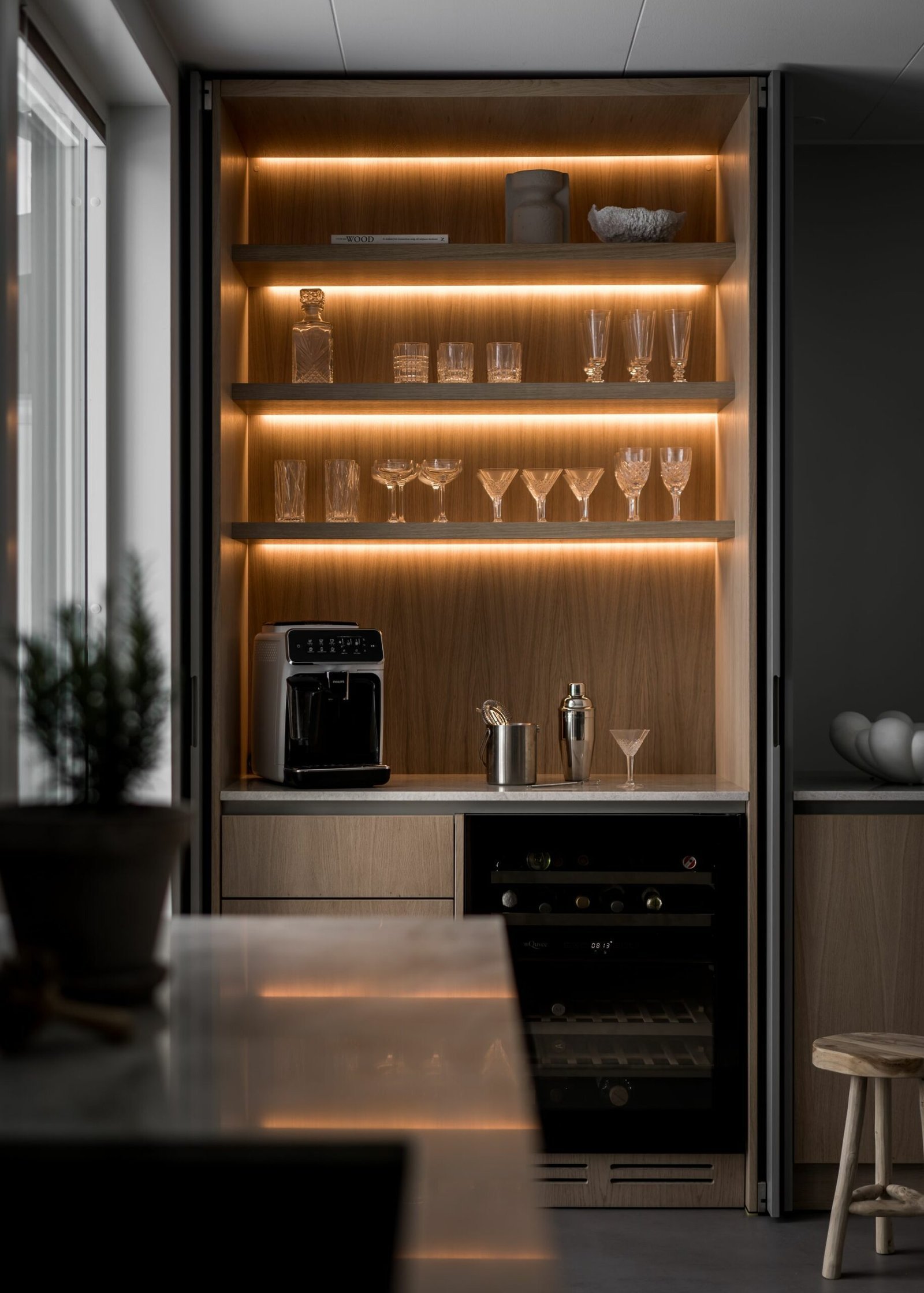 Vi eliminerade alla väggskåp och koncentrerade istället förvaringen till en generös köksö och underskåp. Väggen bakom spisen fick öppna hyllor i massiv ek för det allra vackraste porslinet. Materialen hölls enkla: vitlaserad ek, ljus komposit och diskreta messingdetaljer.