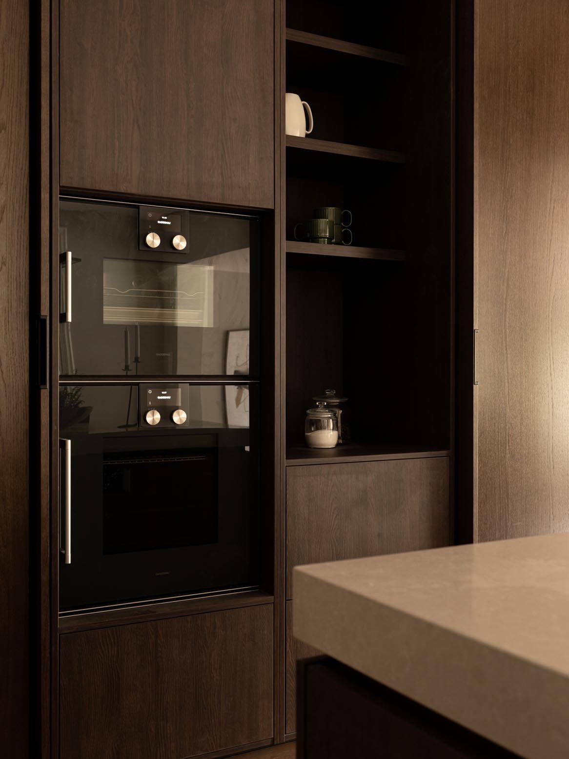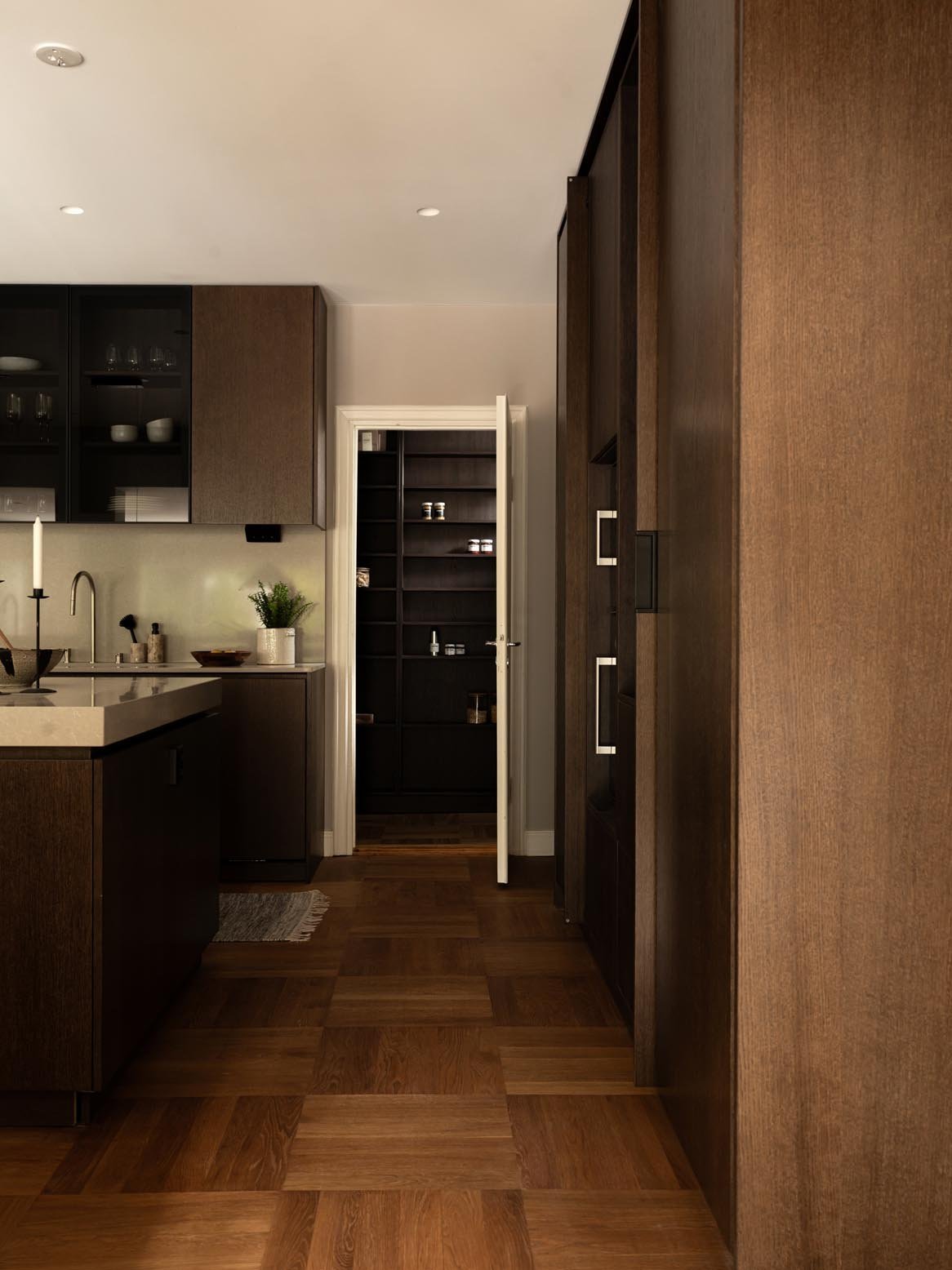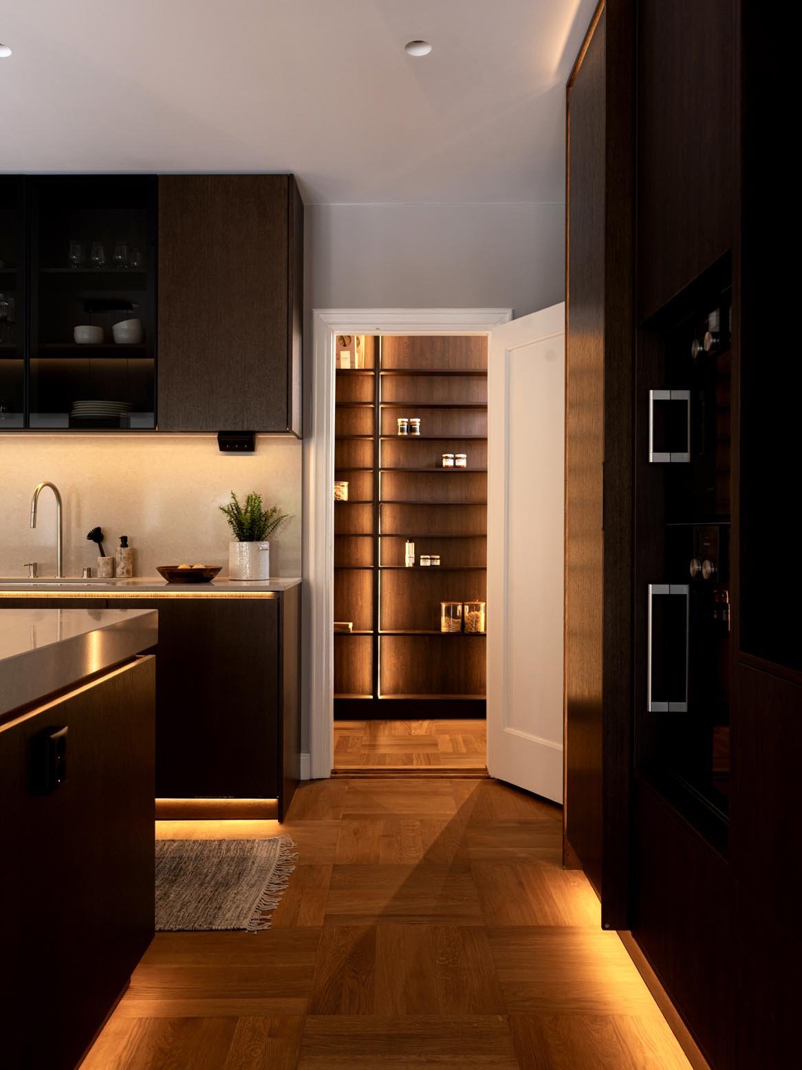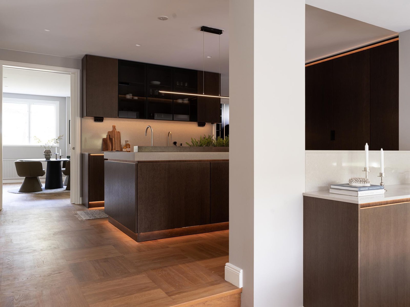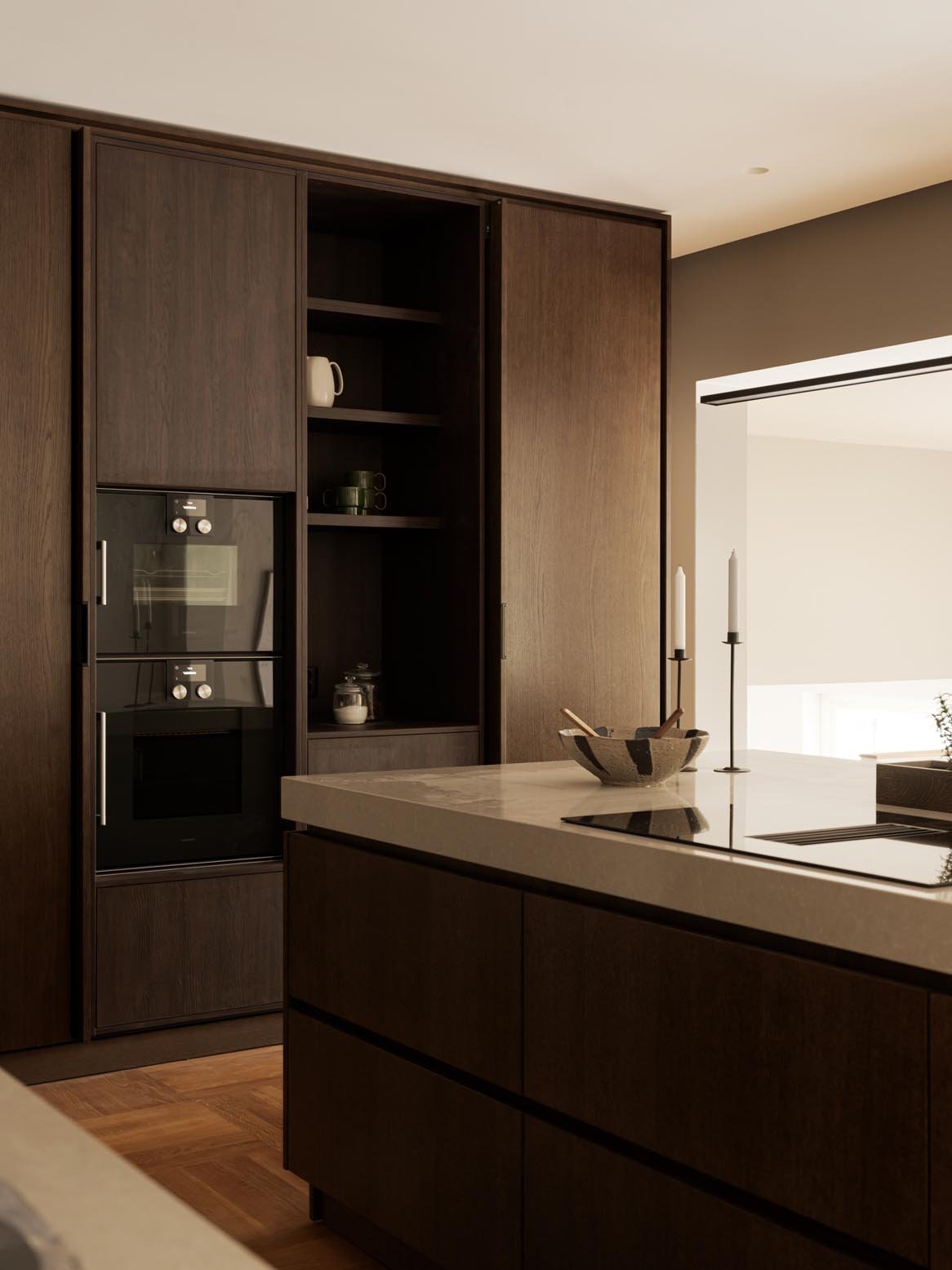 Vi designade ett system med pocketdörrar i massivt mörkt trä som glider in i väggen och döljer hela kökspartiet. När dörrarna är öppna har familjen ett fullt fungerande kök med alla moderna bekvämligheter. När dörrarna stängs ser gästerna bara en elegant trävägg. Bakom dörrarna skapade vi smarta förvaringslösningar med utdragbara hyllor och specialanpassade fack för varje köksredskap.
