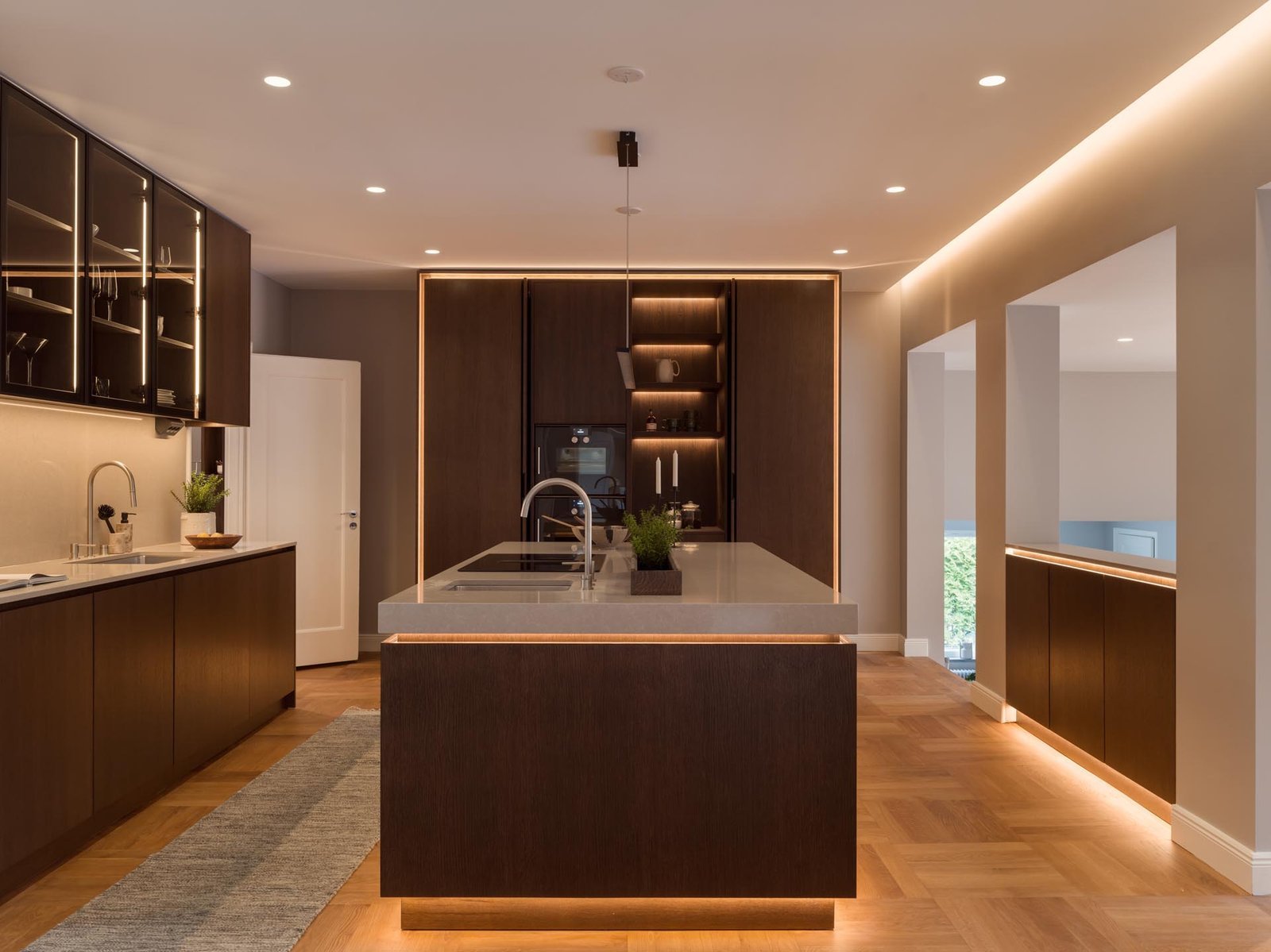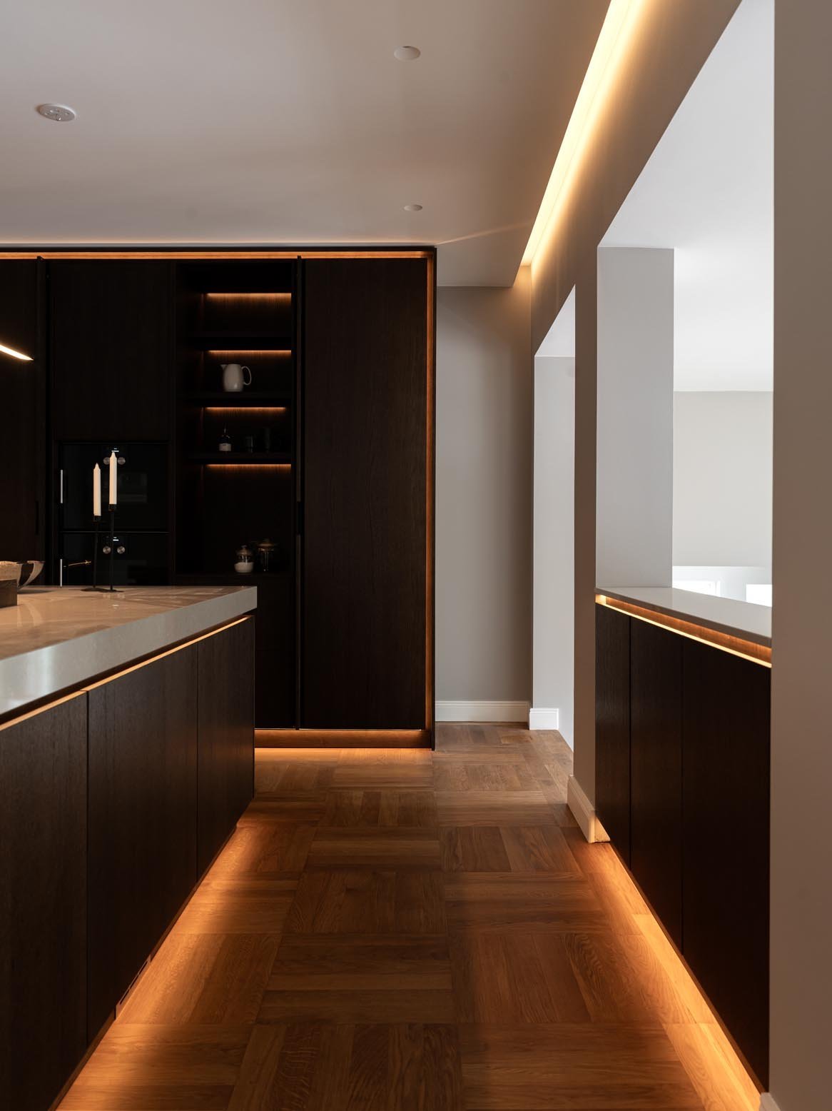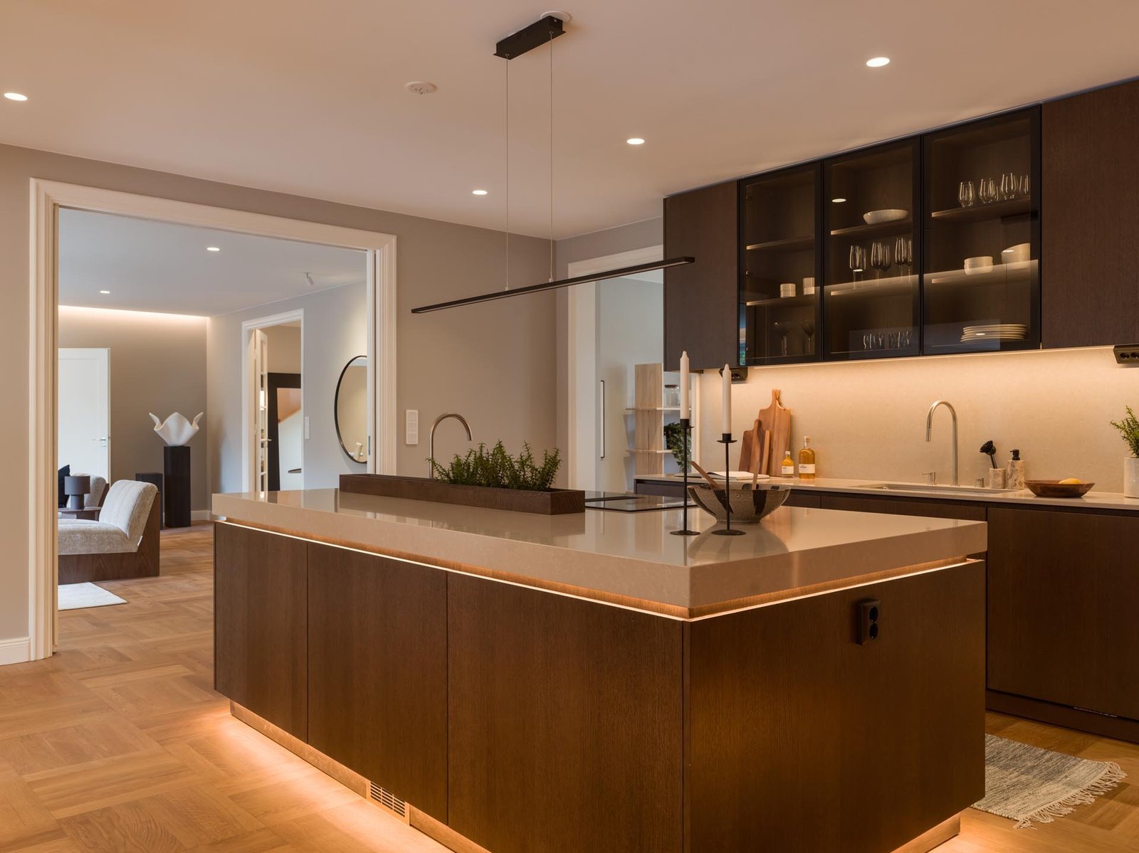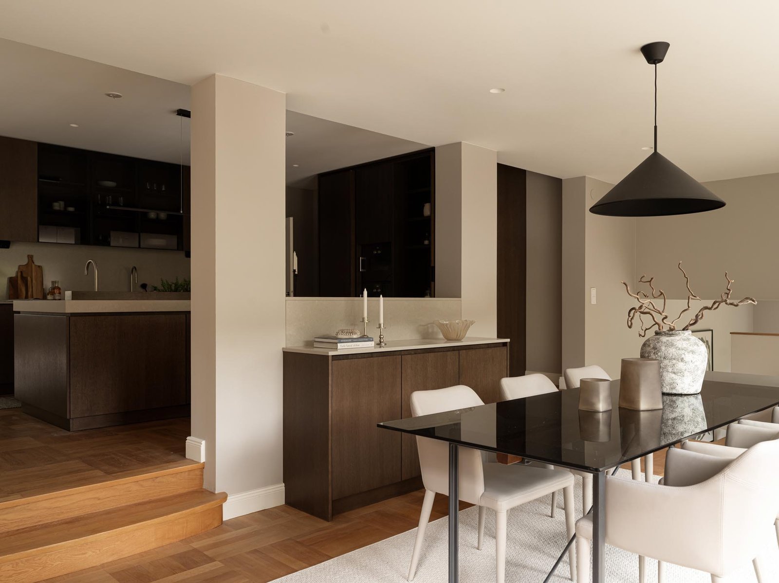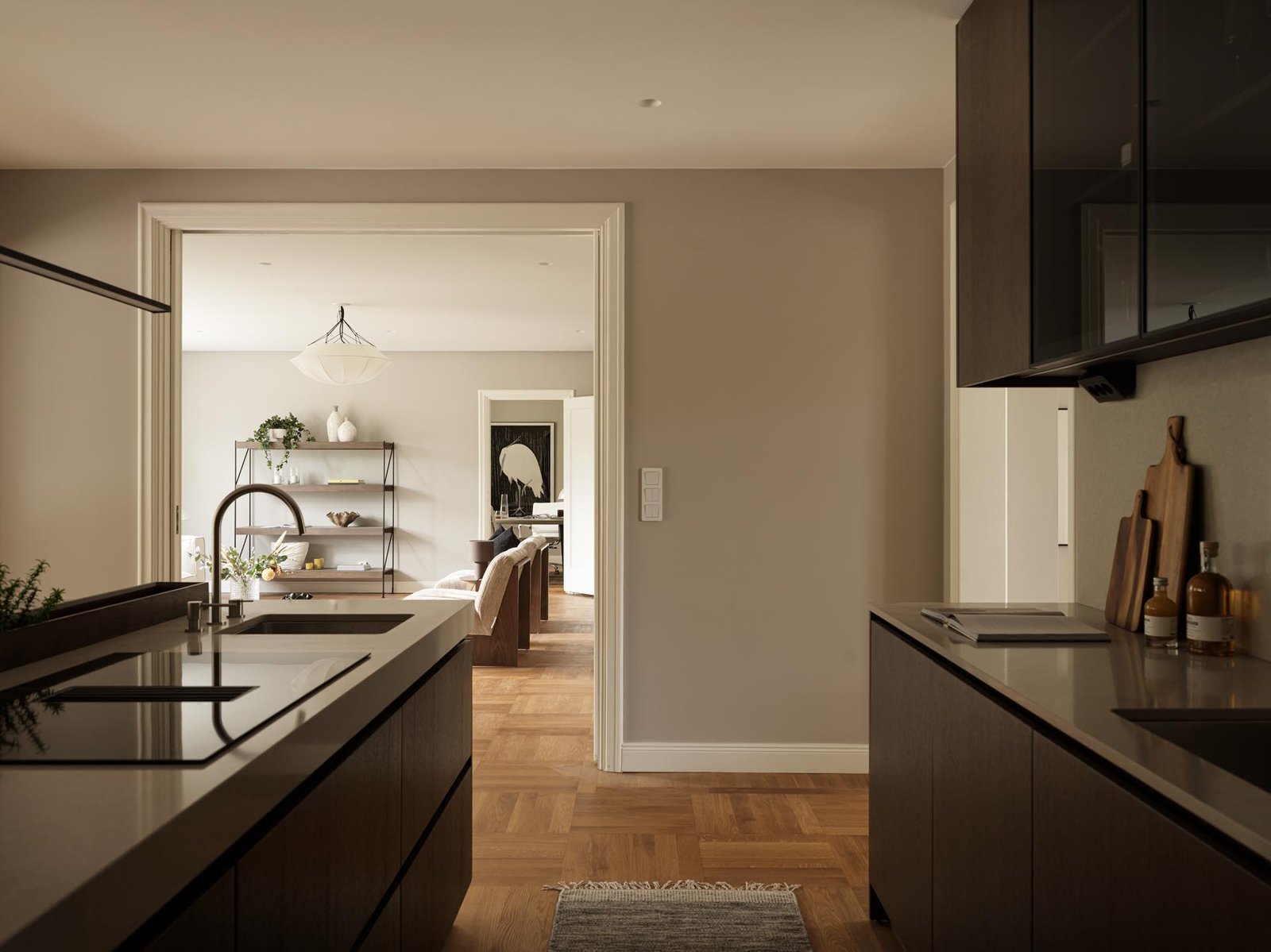 Vi designade ett system med pocketdörrar i massivt mörkt trä som glider in i väggen och döljer hela kökspartiet. När dörrarna är öppna har familjen ett fullt fungerande kök med alla moderna bekvämligheter. När dörrarna stängs ser gästerna bara en elegant trävägg. Bakom dörrarna skapade vi smarta förvaringslösningar med utdragbara hyllor och specialanpassade fack för varje köksredskap.