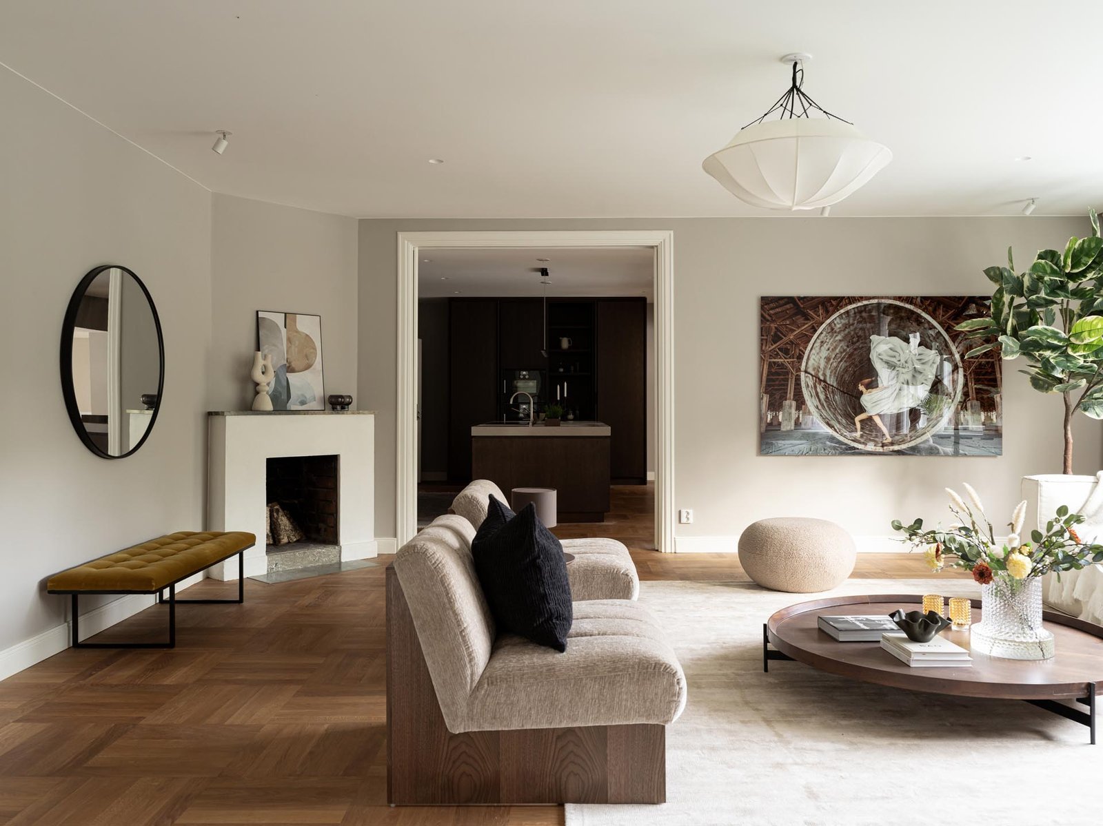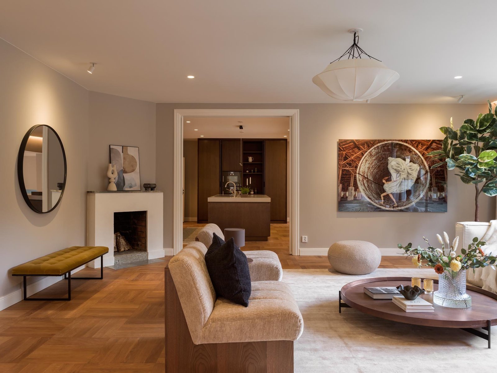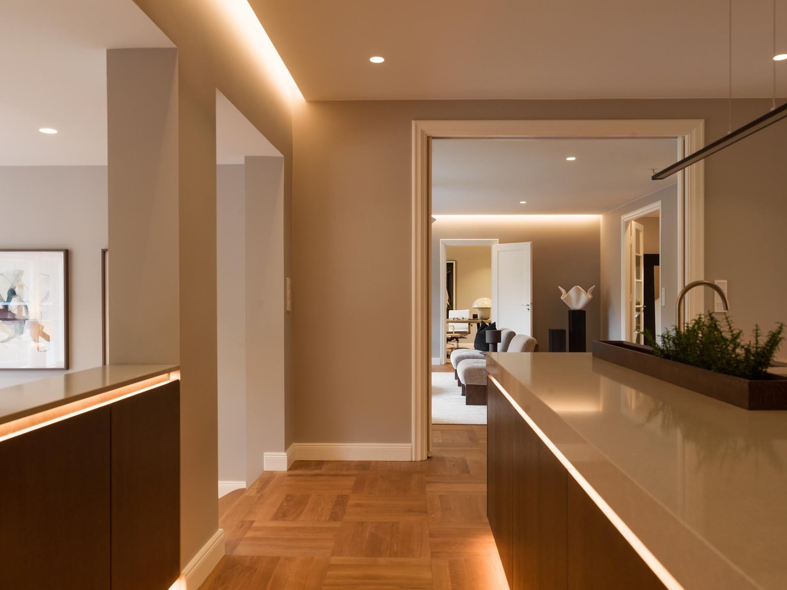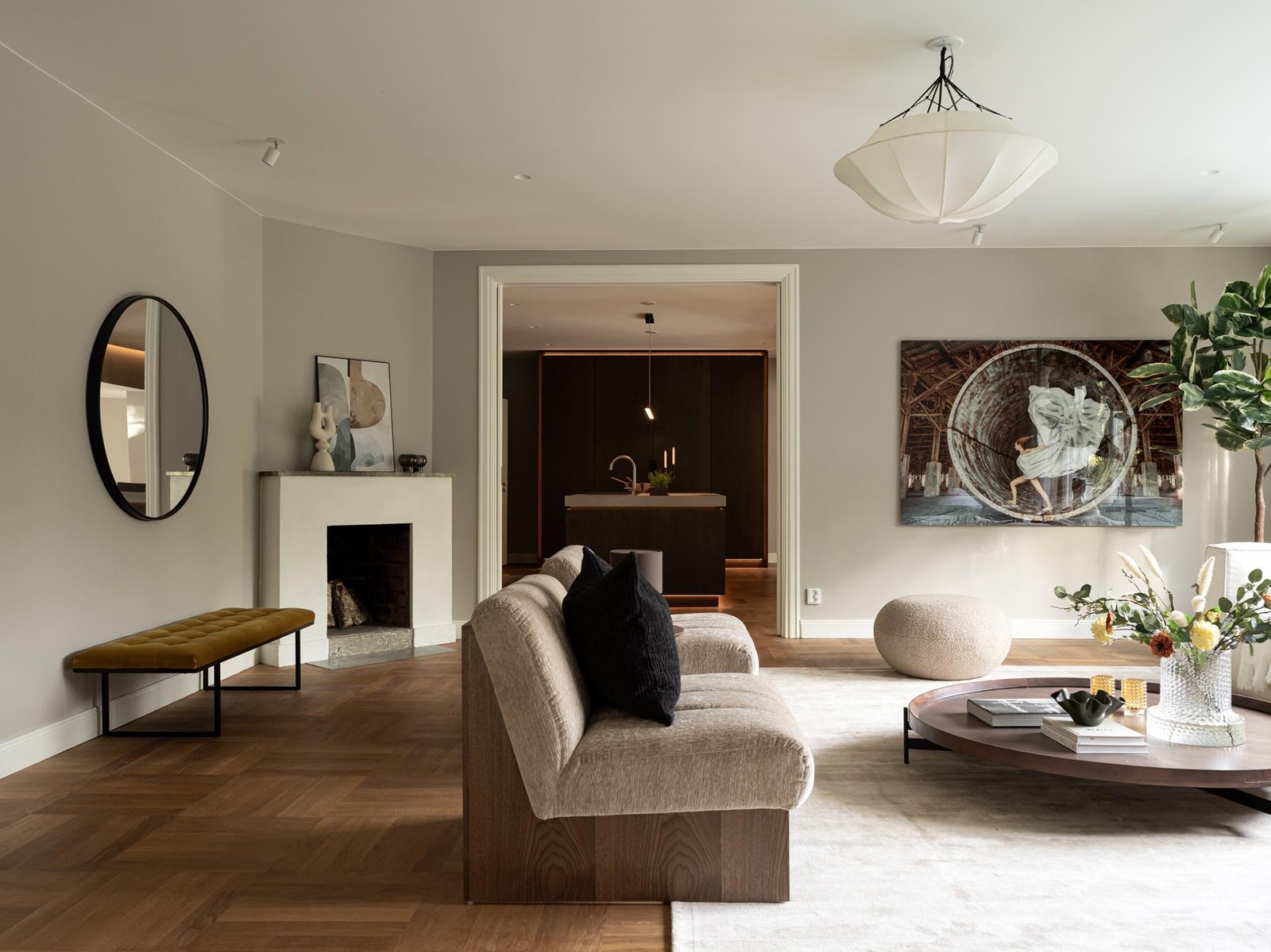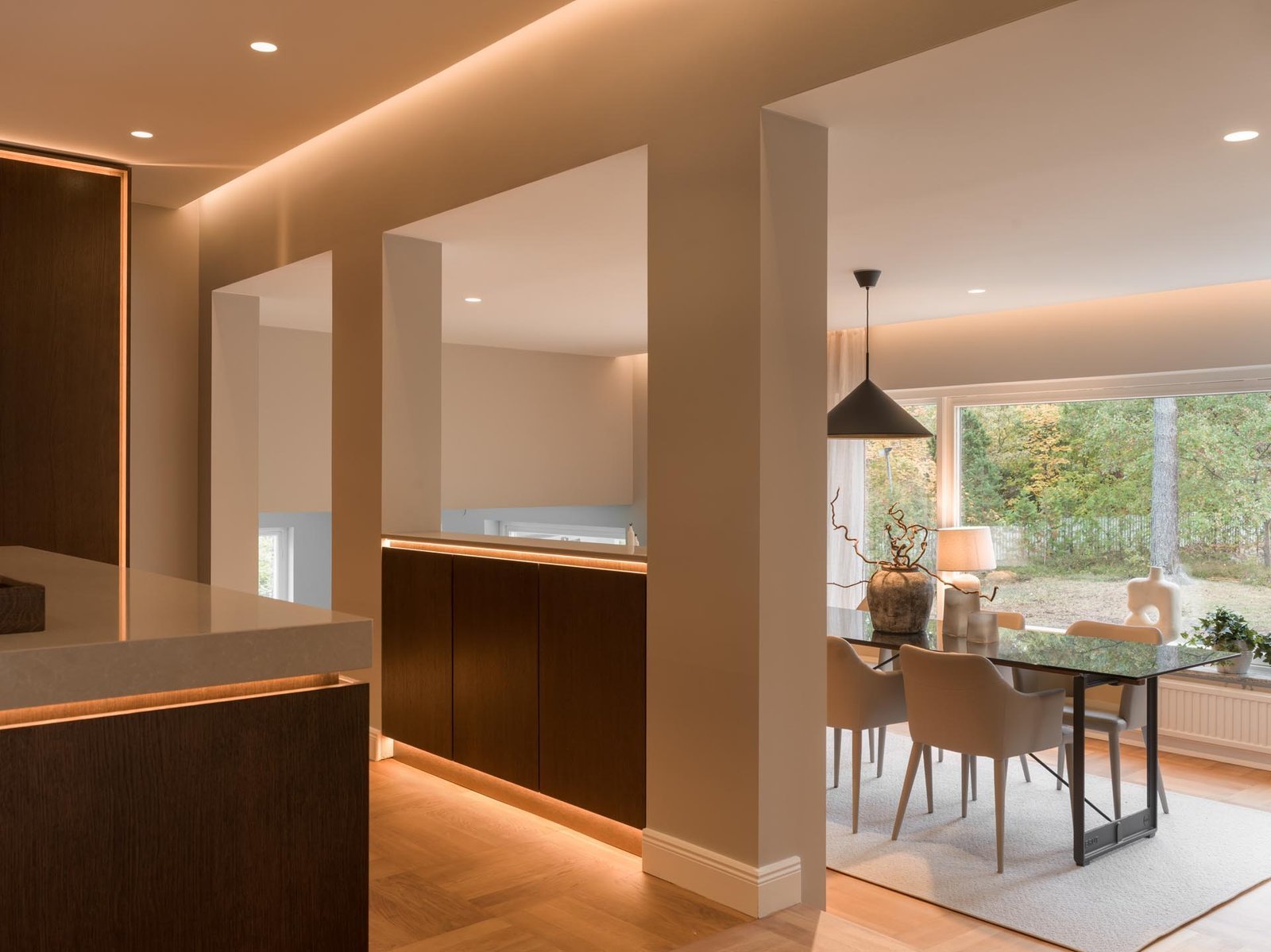 Vi designade ett system med pocketdörrar i massivt mörkt trä som glider in i väggen och döljer hela kökspartiet. När dörrarna är öppna har familjen ett fullt fungerande kök med alla moderna bekvämligheter. När dörrarna stängs ser gästerna bara en elegant trävägg. Bakom dörrarna skapade vi smarta förvaringslösningar med utdragbara hyllor och specialanpassade fack för varje köksredskap.