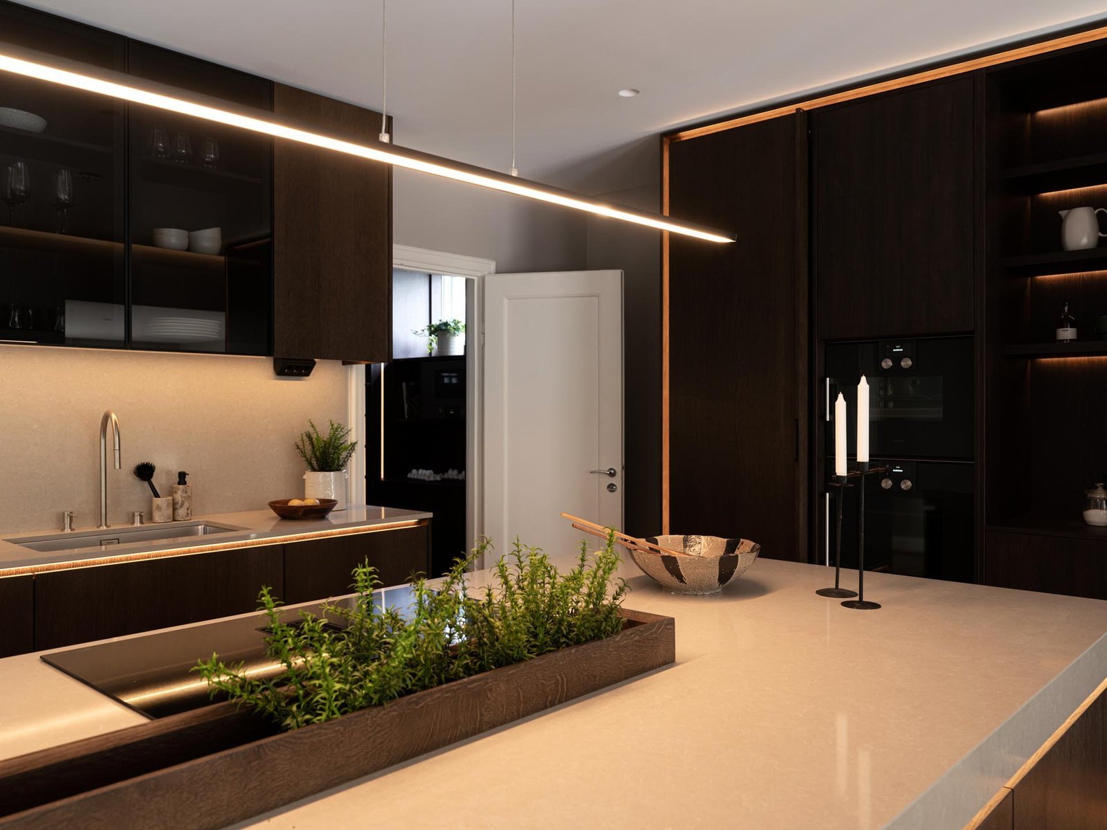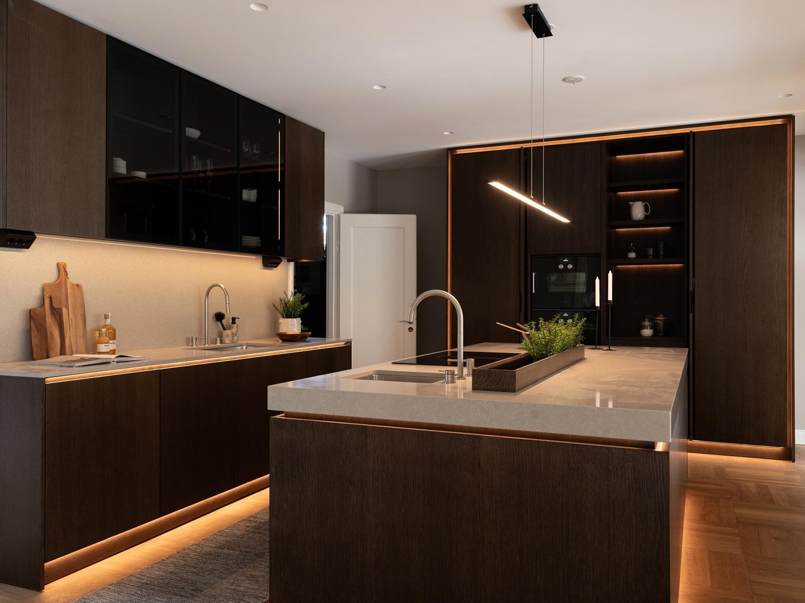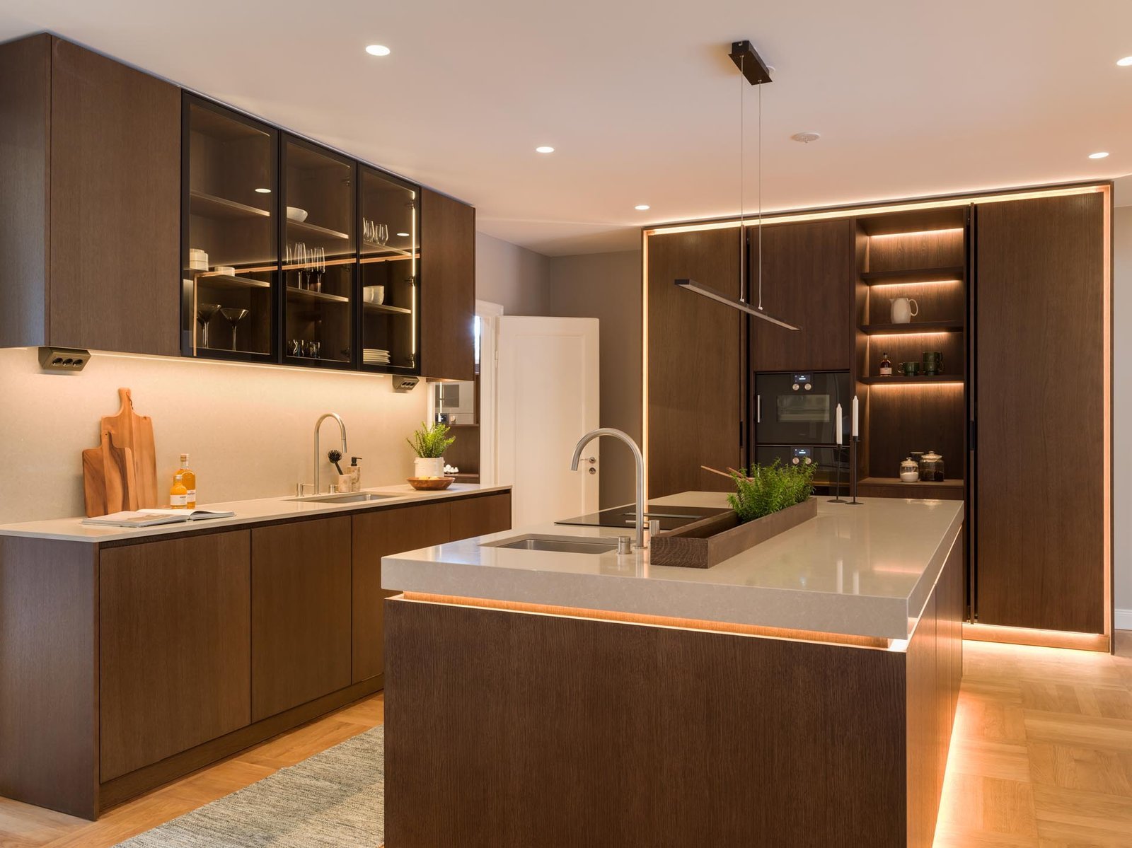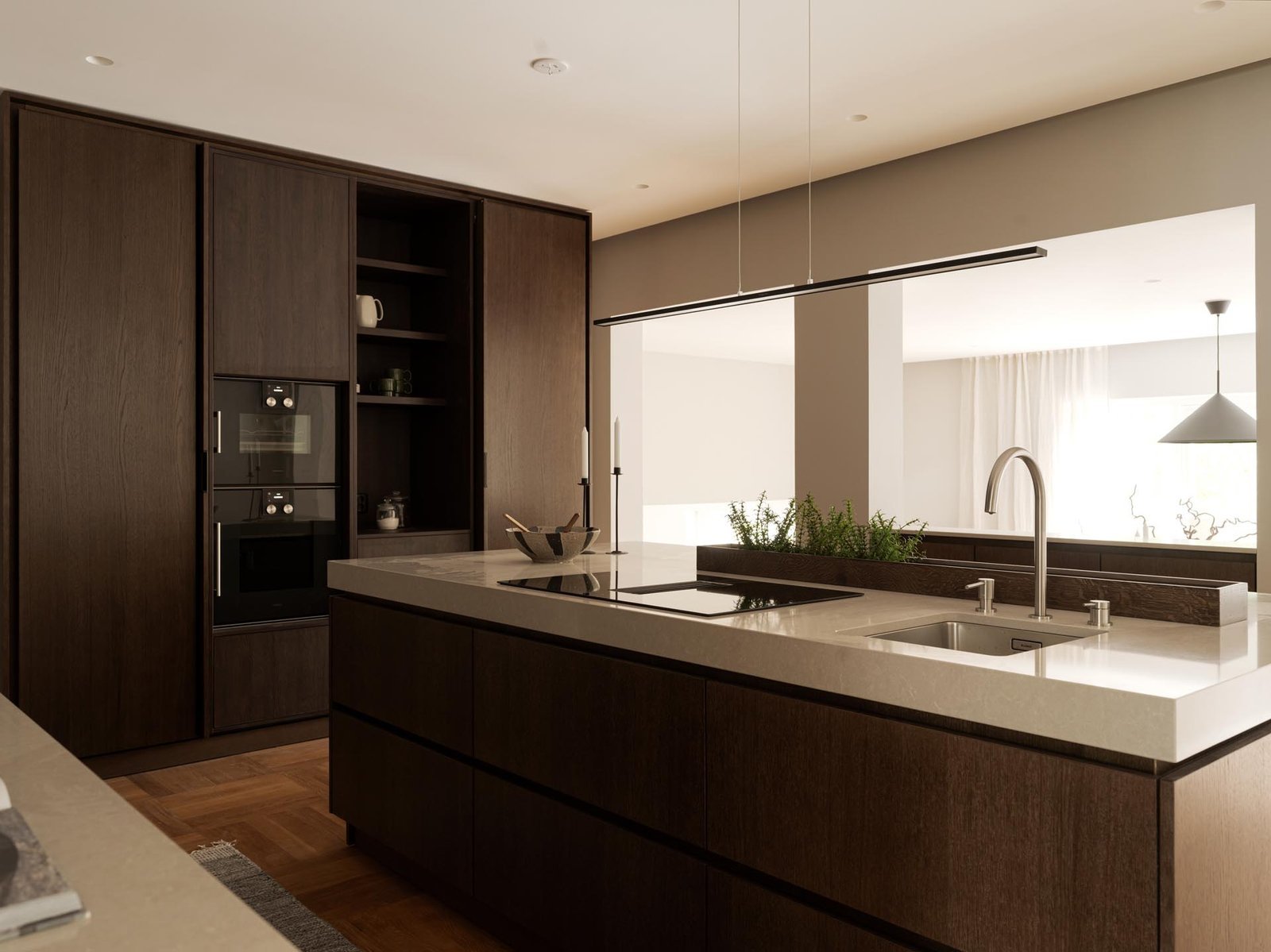 Exklusivt träkök med pocketdörrar i mörkt trä, dolda vitvaror och smarta förvaringslösningar. Modern design och funktion i perfekt harmoni.