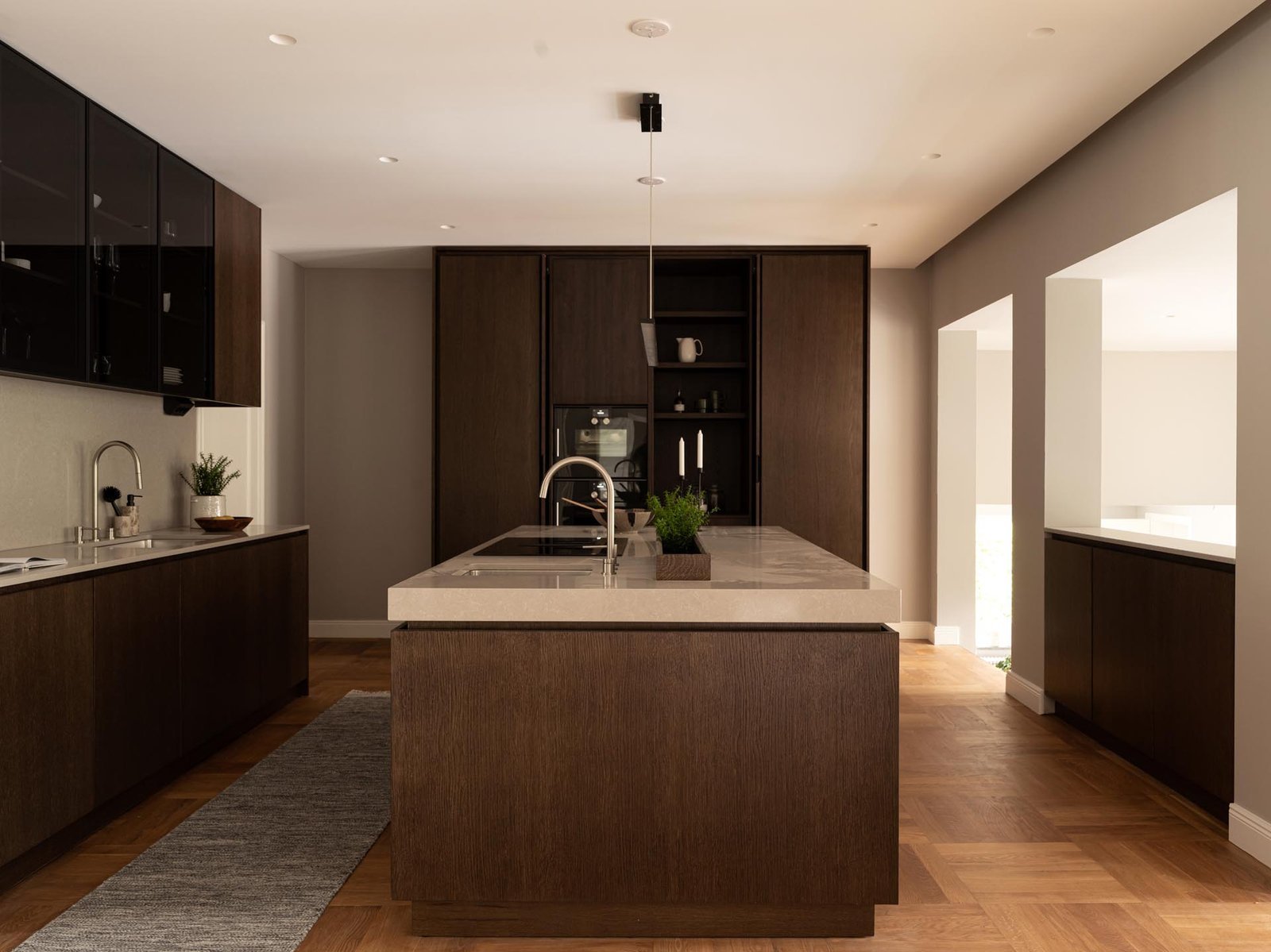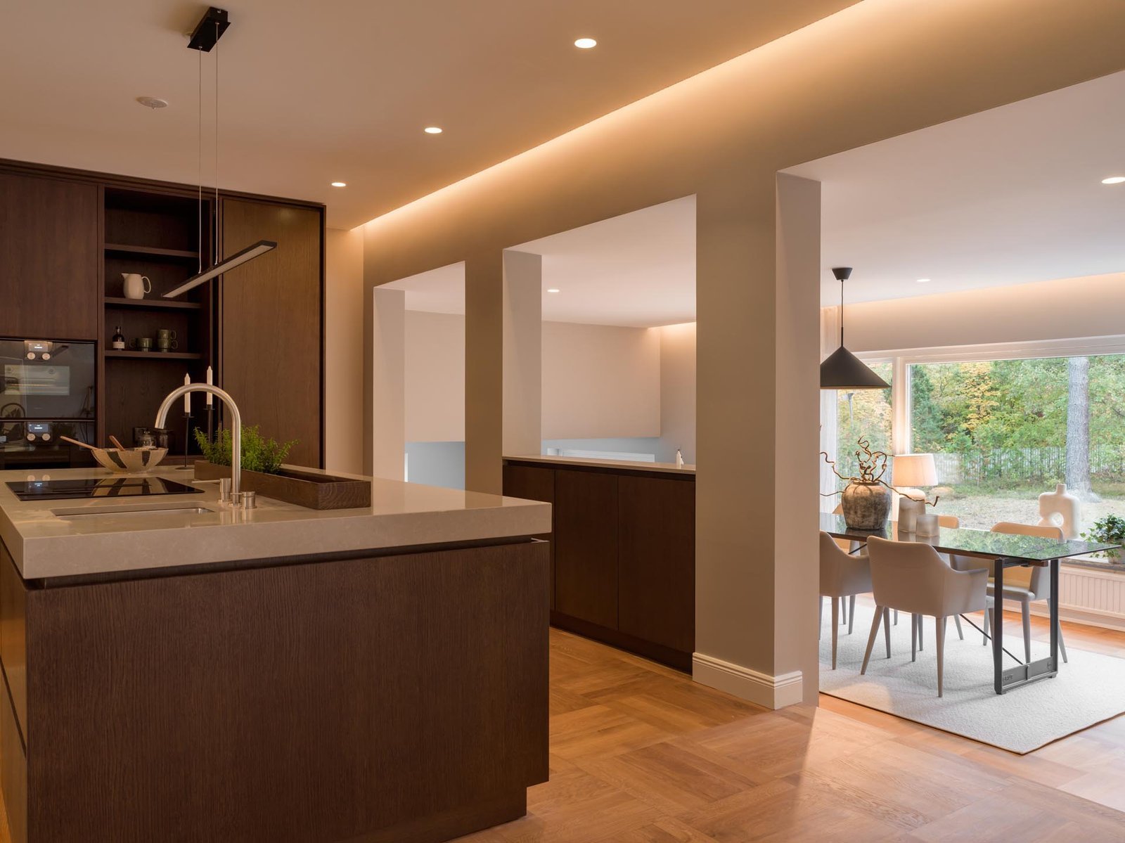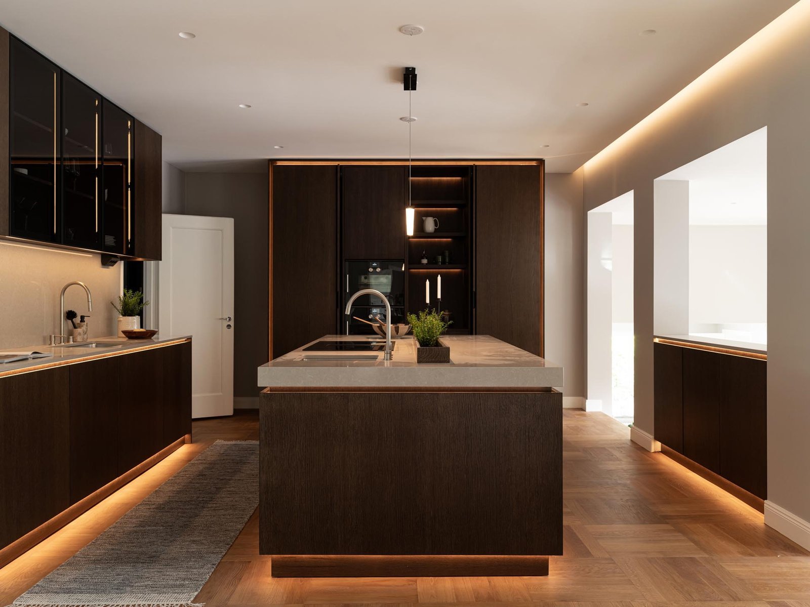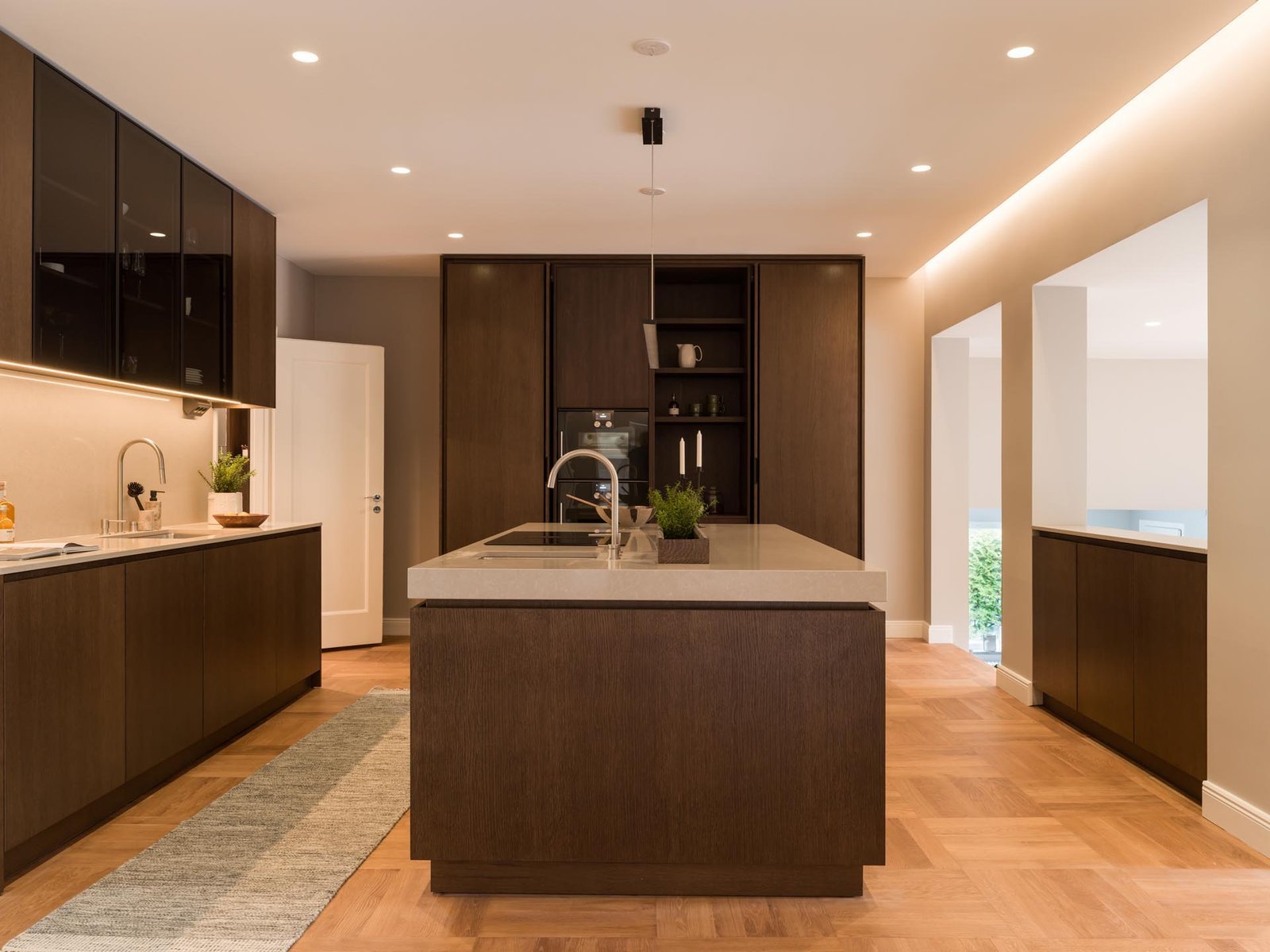 Exklusivt träkök med pocketdörrar i mörkt trä, dolda vitvaror och smarta förvaringslösningar. Modern design och funktion i perfekt harmoni.