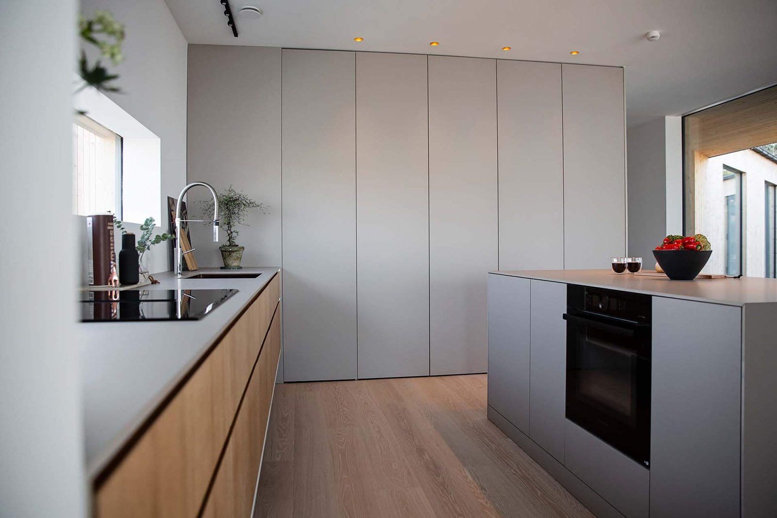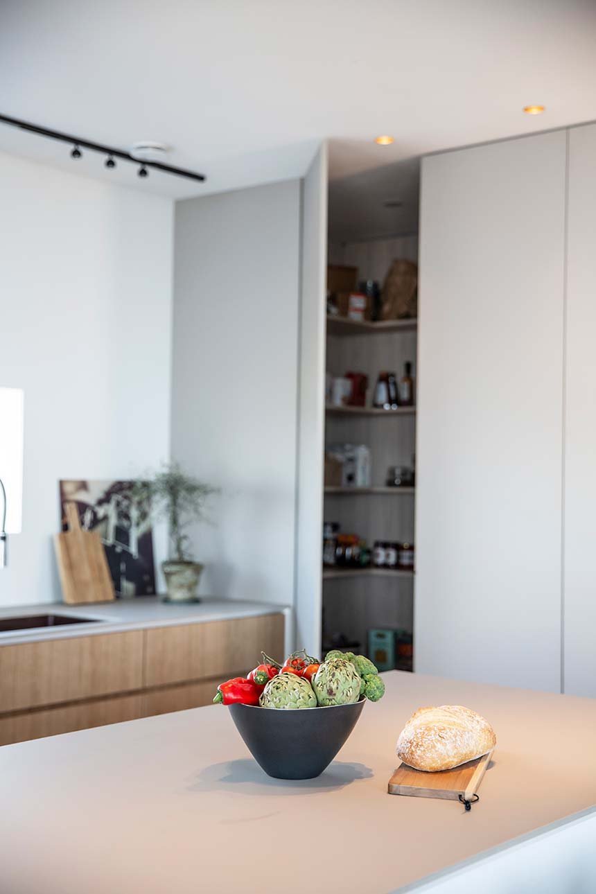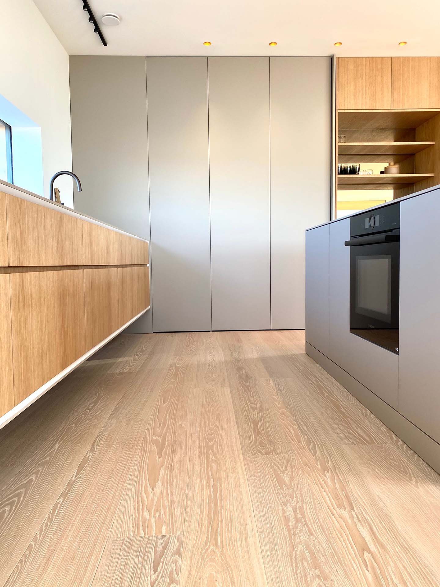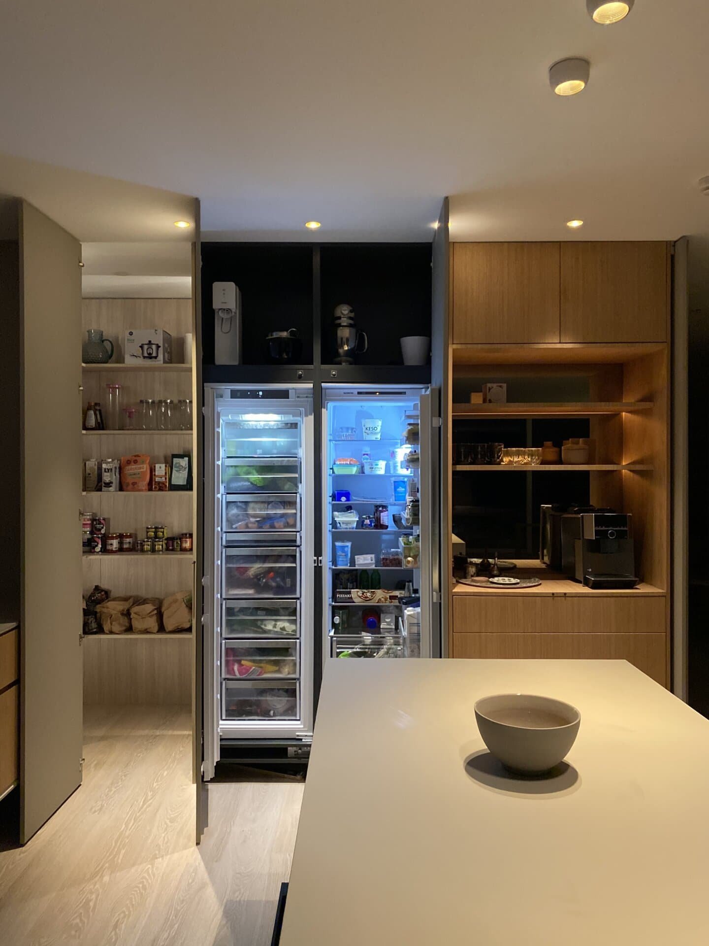 Köket bevisar att minimalism och funktion inte behöver vara motsatser. När allt är undanplockat ser det ut som ett konstgalleri – men öppna rätt lucka och ett professionellt kök avslöjas. Kunden använder det dagligen för receptutveckling och matlagning på hög nivå.
