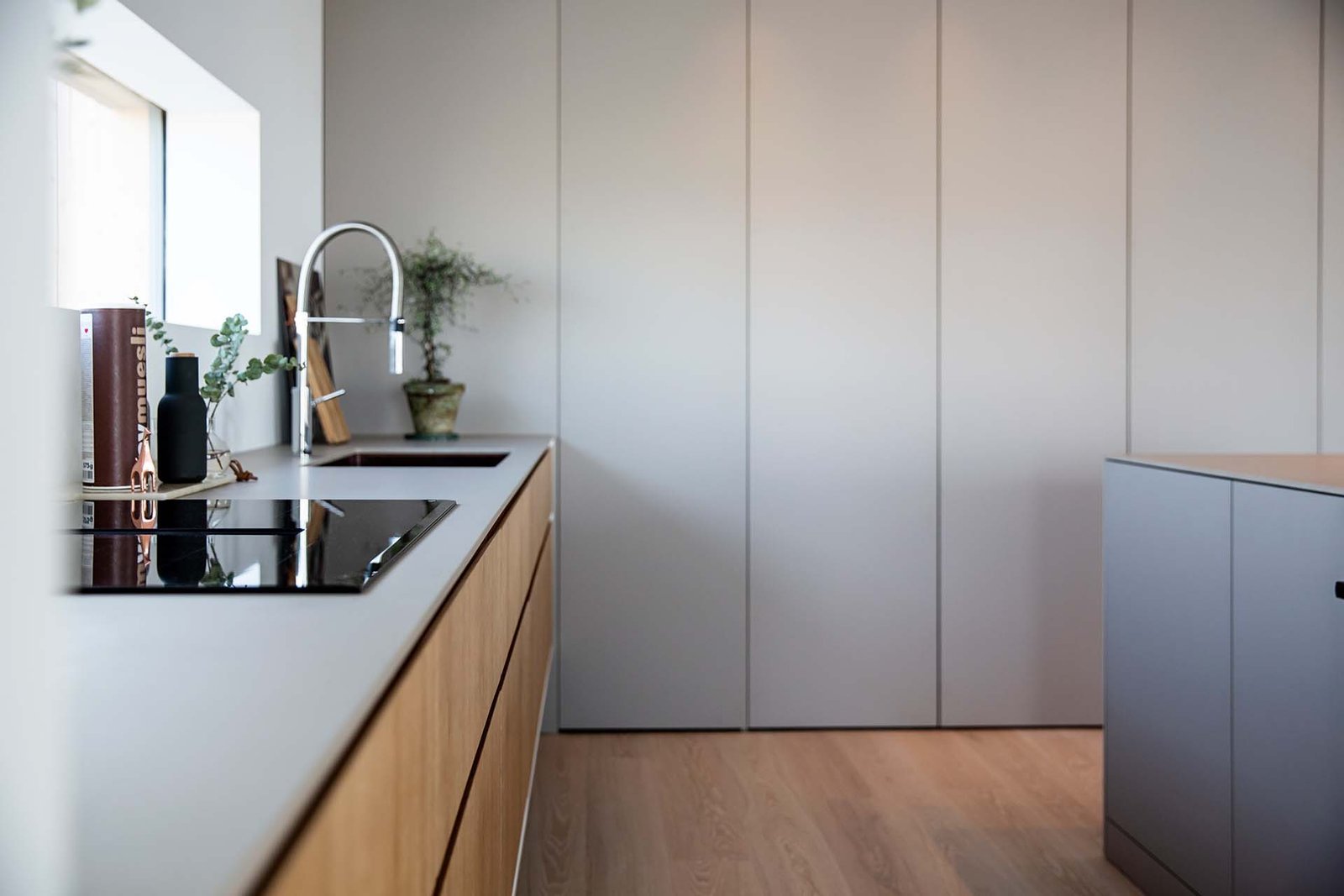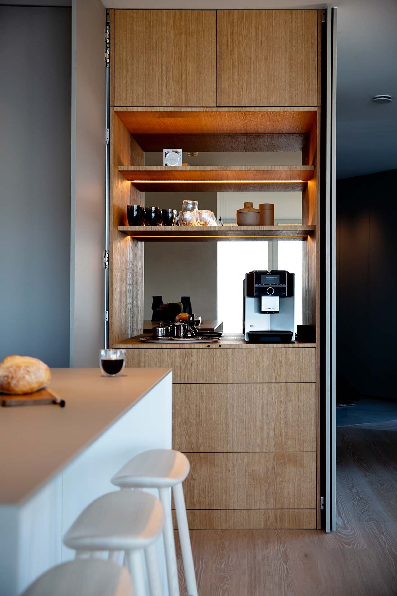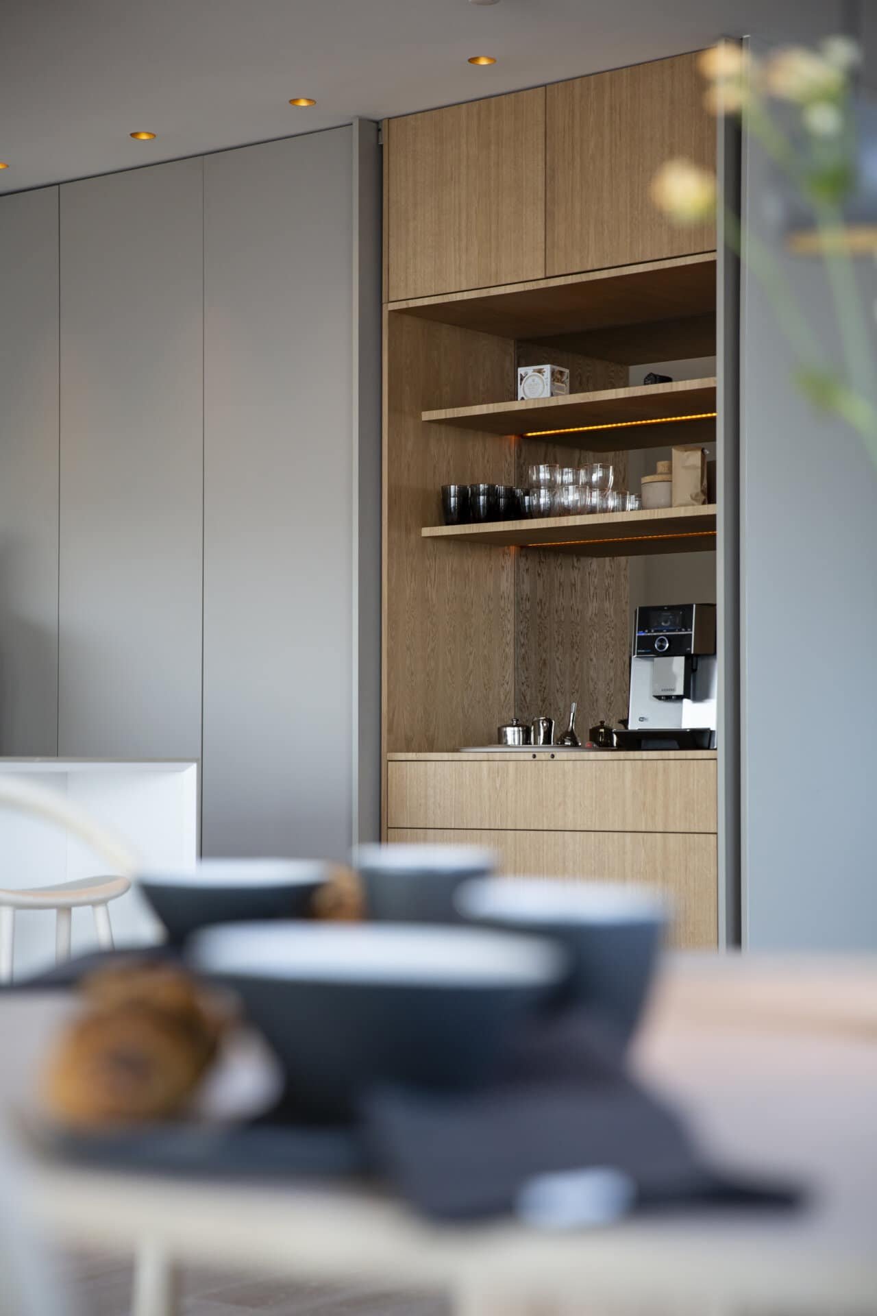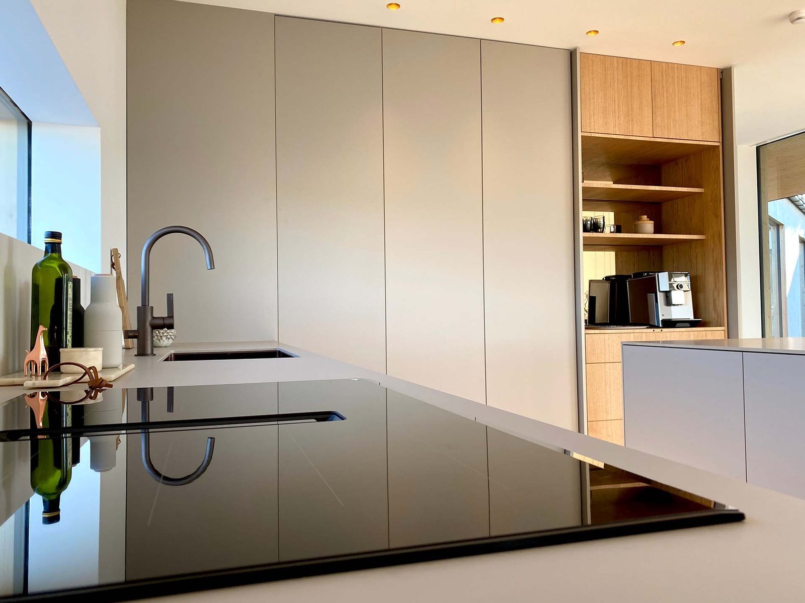 Köket bevisar att minimalism och funktion inte behöver vara motsatser. När allt är undanplockat ser det ut som ett konstgalleri – men öppna rätt lucka och ett professionellt kök avslöjas. Kunden använder det dagligen för receptutveckling och matlagning på hög nivå.