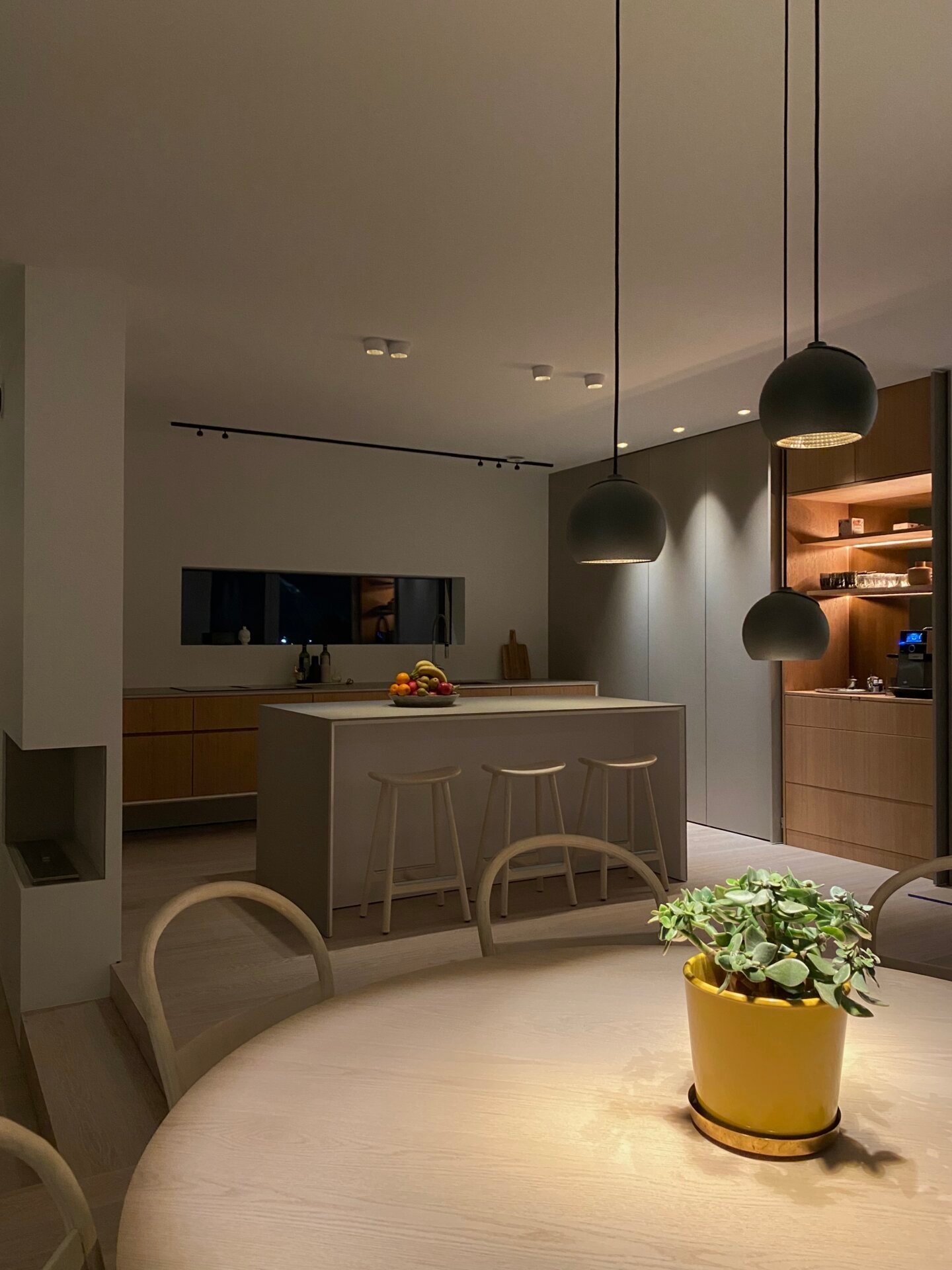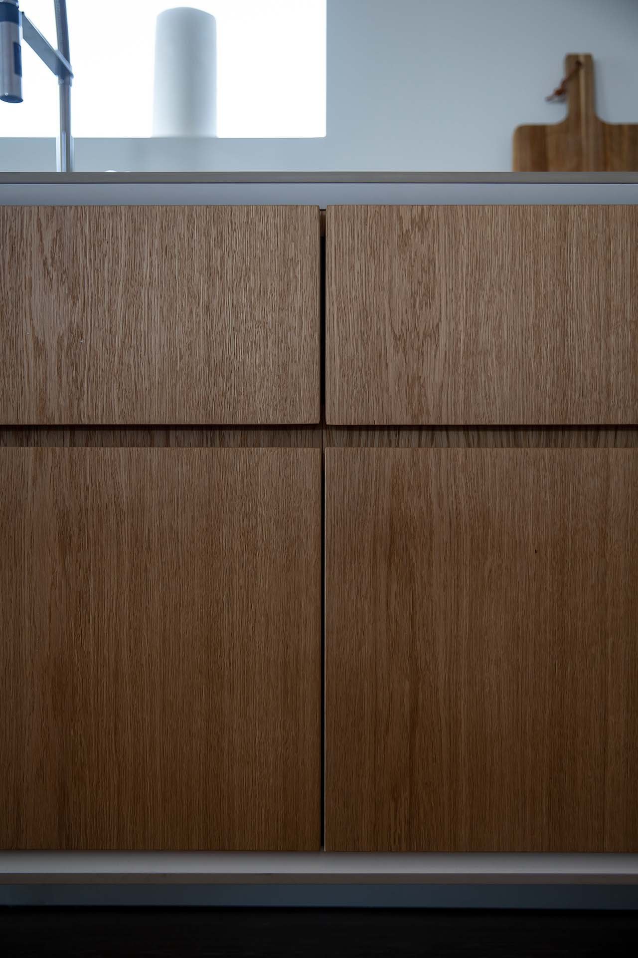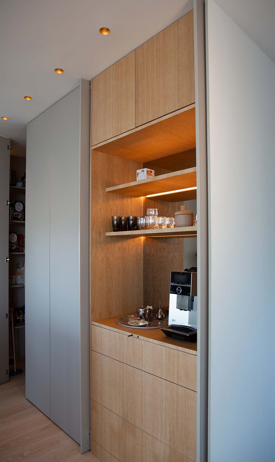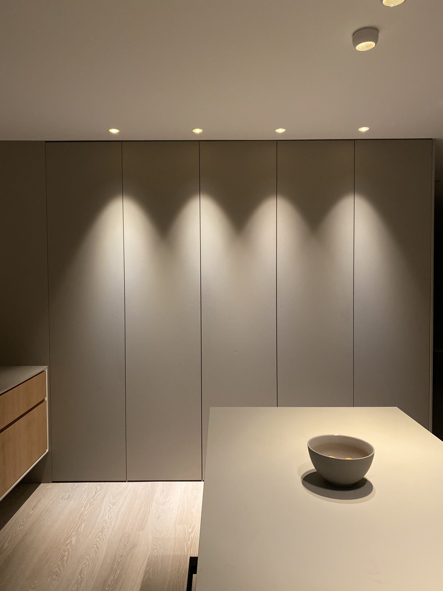 Köket bevisar att minimalism och funktion inte behöver vara motsatser. När allt är undanplockat ser det ut som ett konstgalleri – men öppna rätt lucka och ett professionellt kök avslöjas. Kunden använder det dagligen för receptutveckling och matlagning på hög nivå.