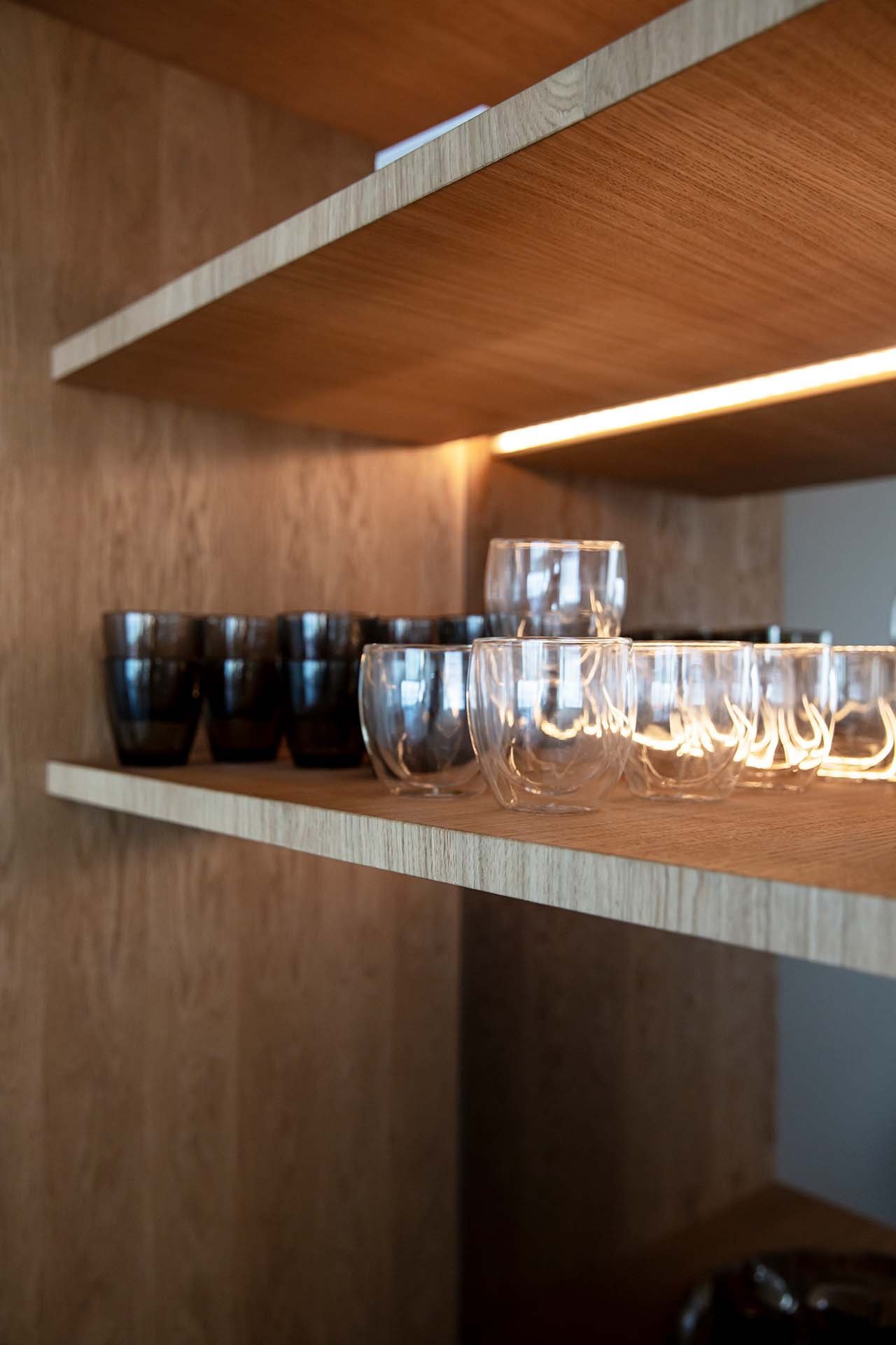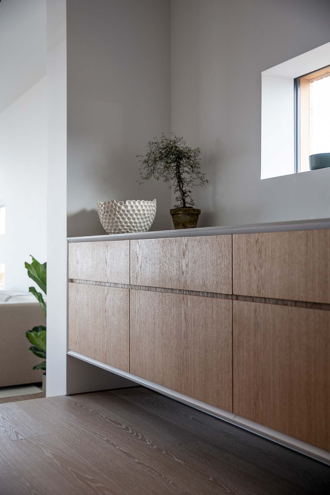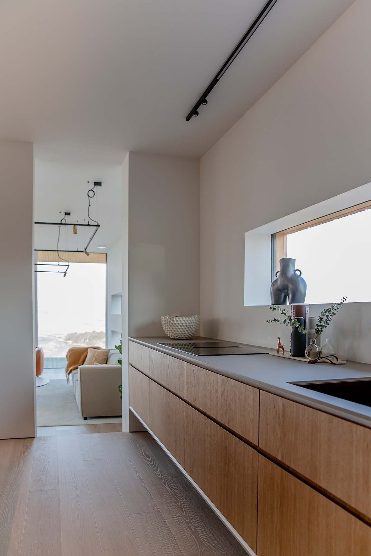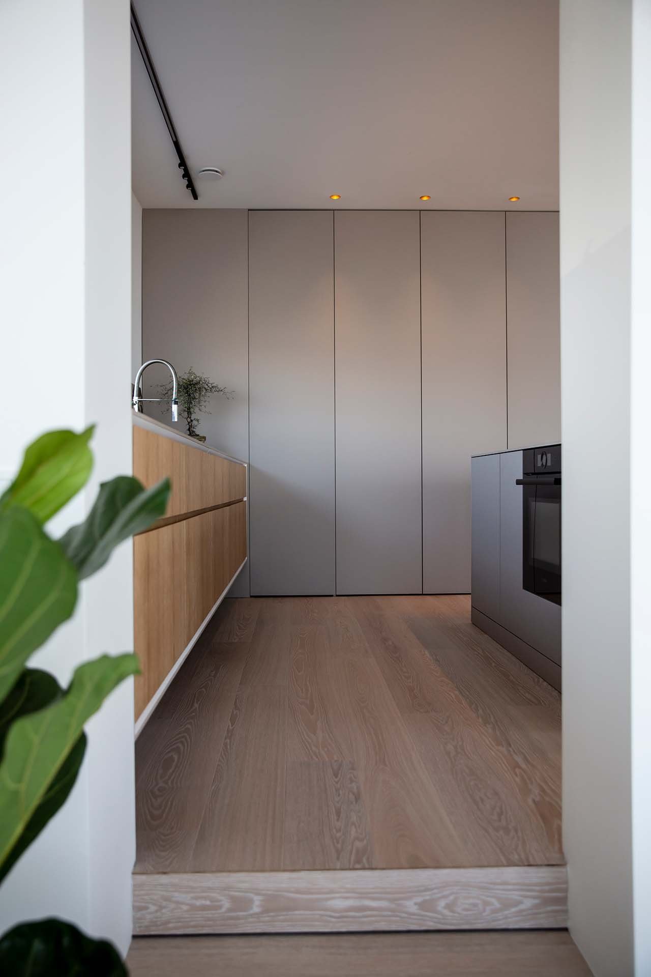 Köket bevisar att minimalism och funktion inte behöver vara motsatser. När allt är undanplockat ser det ut som ett konstgalleri – men öppna rätt lucka och ett professionellt kök avslöjas. Kunden använder det dagligen för receptutveckling och matlagning på hög nivå.