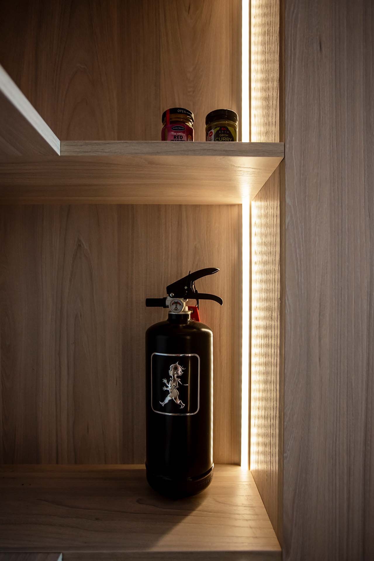 Varje centimeter planerades för att dölja funktioner. Kockknivarna förvaras i en magnetlist inbyggd i lådkanten. Kryddorna står i utdragbara lådor i bänkhöjd. Proffskökets alla maskiner – pastamaskin, mixer, vakuumförpackare – har egna utdragbara hyllor som döljs bakom släta fronter. Bänkskivan i svart granit är tillräckligt tjock för att ta emot het gjutjärnskastrull direkt från ugnen.